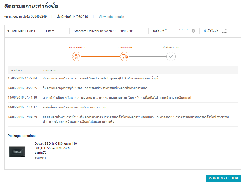 วันที่ 15 ตอน 17.22น. สถานะแจ้งจัดส่งสินค้าแล้ว "สินค้าของคุณอยู่ในระหว่างการจัดส่งโดย Lazada Express(LEX)" โดยผมทราบว่ามี SMS เข้าในมือถือผม แต่ไม่ได้สนใจตอนนั้น กำลังทำธุระอยู่