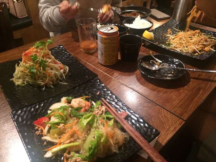 ไปสามคนสั่งกันมาคนละอย่างมาลองชิมดูก่อน เพราะมีประสบการณ์การไปทานอาหารไทยจากที่อื่นมาเจออร่อยๆ ก็เยอะ ทานไม่ได้ก็แยะ 55 อาหารที่สั่งไปตอนแรกก็มี ยำวุ้นเส้น, ผัดไทยไก่, Beef Red Curry (น่าจะเป็นแพนงเนื้อ) หน้าตาอาหารก็ผ่านอยู่นะคะ ผัดไทอร่อย ยำวุ้นเส้นก็โอเคใช้ได้ ส่วนแพนงเนื้อรสชาติปานกลางเหมือนเขาใส่นมมาด้วยน่าจะไม่ค่อยถูกปากคนไทยเท่าไหร่