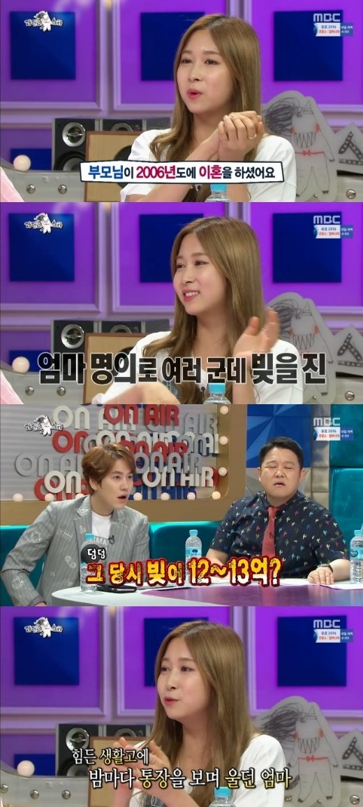 เธอเล่าว่าบ้านของเธอที่เกาะเจจูอยู่ใต้น้ำครึ่งหลังในปี 2007 เนื่องจากท่อระบายน้ำมีใบไม้อุดตัน แล้วเธอเล่าว่า พ่อกับแม่หย่ากันปี 2006 พ่อสร้างหนี้ก้อนโตแต่อยู่ในชื่อแม่ เขาบอกว่าจะไปโซลแล้วทั้งสองคนเลยเลิกัน ตอนนั้นมีหนี้อยู่ พันสองหรือพันสามร้อยล้าน (36 - 39 ล้านบาท)