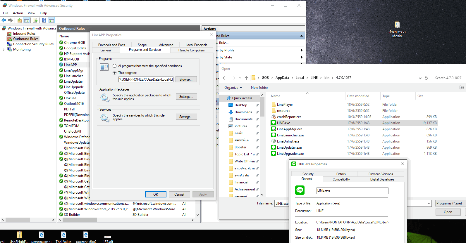 รูป ผมลอง Set firewall ของ Windows 10 64 bit ให้ Line สามารถใช้งาน net ได้ (เดิมพอ set Rules ของ Firewall แล้วก็จะใช้งานได้ปกติครับ)