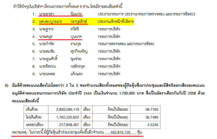*อาจเป็นบริษัทเดียวในประเทศไทยที่มีมติ "ไม่อนุมัติค่าตอบแทนกรรมการบริษัท" และในวาระนี้มีคะแนนเพิ่มขึ้นมาแบบมีนัยยะสำคัญจำนวน 462 ล้านหุ้น
