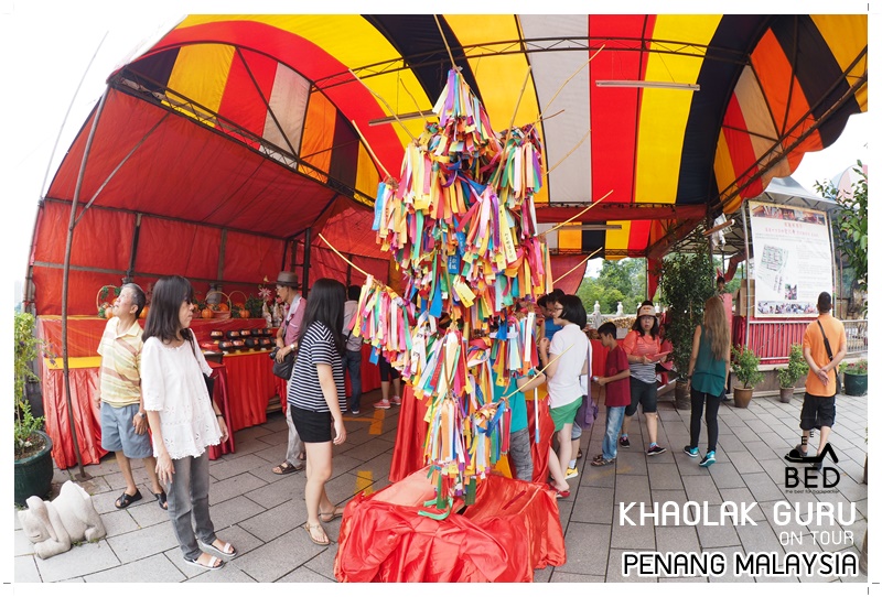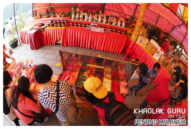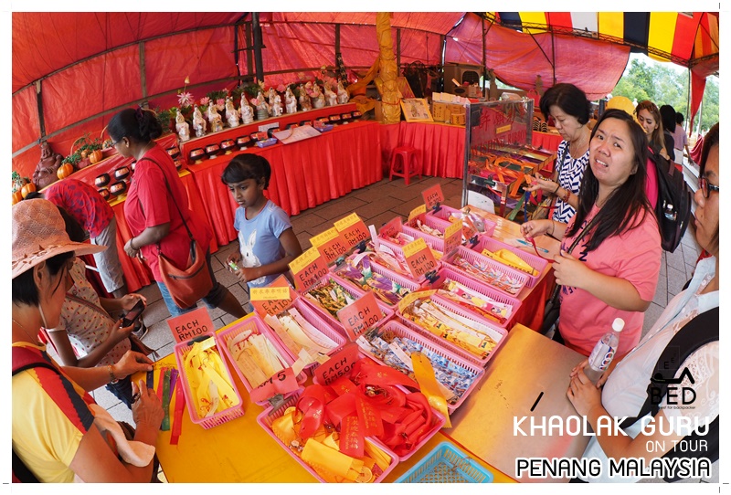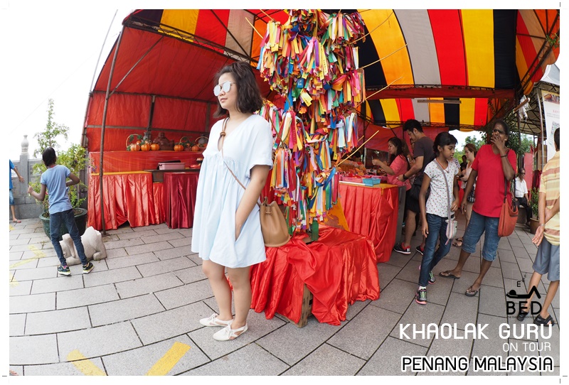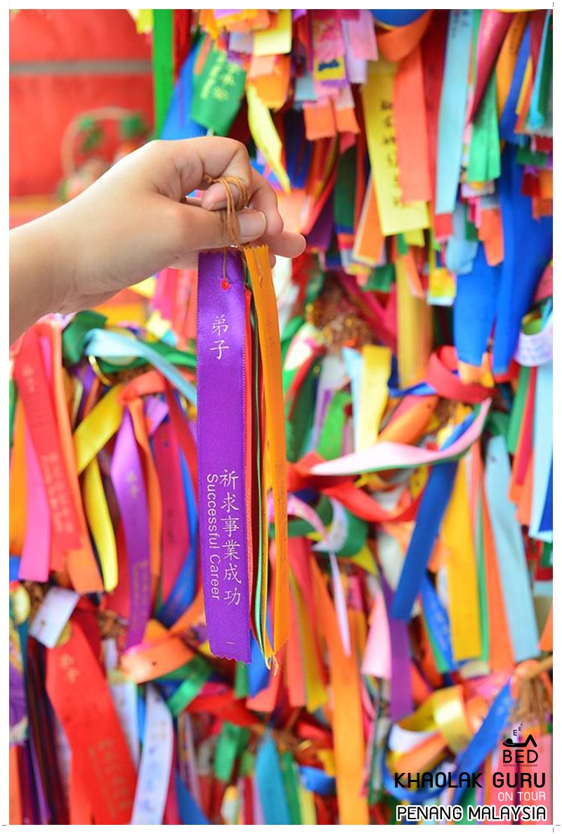 หลังจากไหว้เจ้าแม่กวนอิมแล้ว ก็มาเลือกผ้าสีๆ ขอพรต่างๆ แยกไปตามสี เช่น เงินทอง สุขภาพ ครอบครัว ความรัก โดยทำบุญแผ่นละ 1 RM