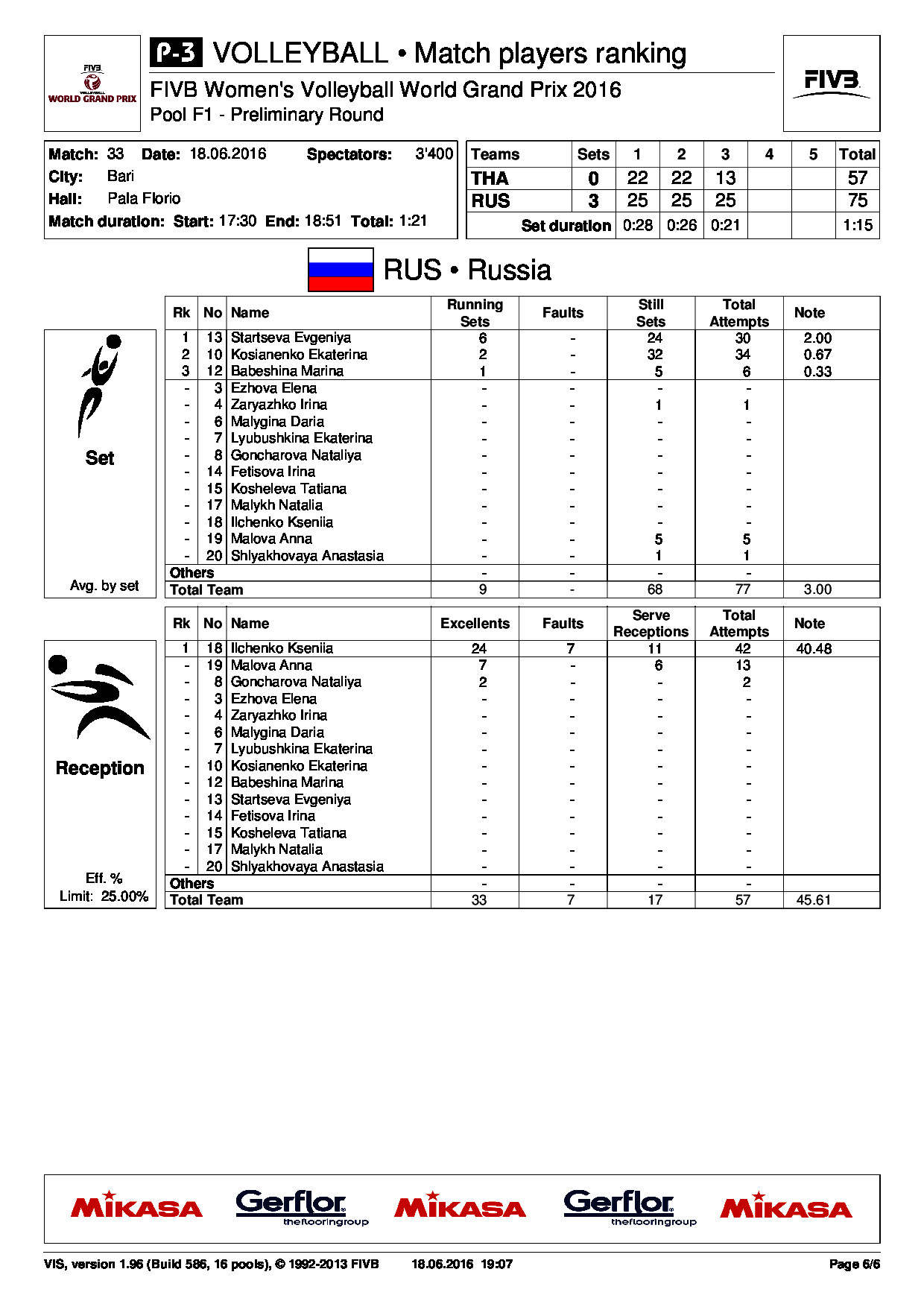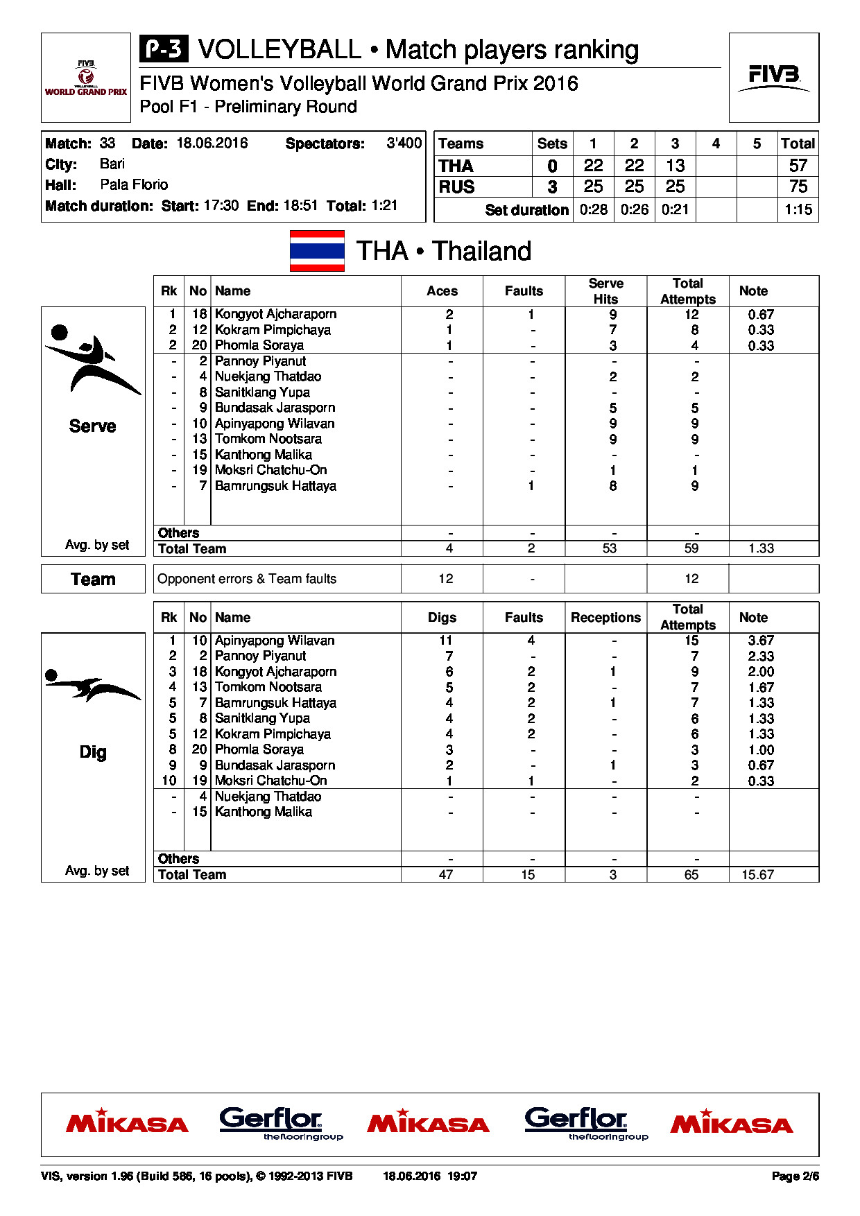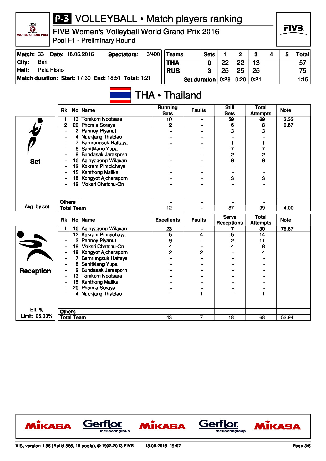 [----- เทป&สถิติ -----] >> ไทย Vs รัสเซีย : วอลเลย์บอลเวิลด์กรังด์ปรีซ์ 2016