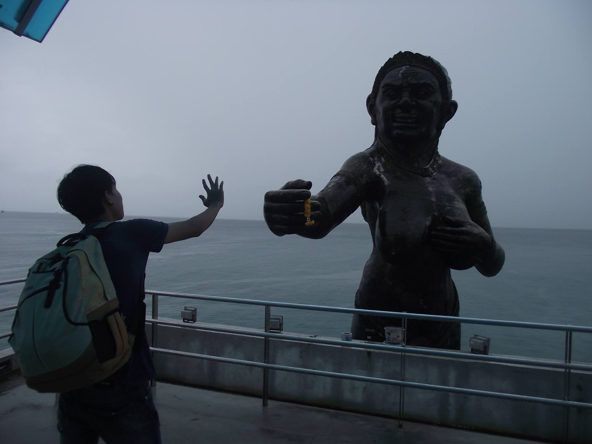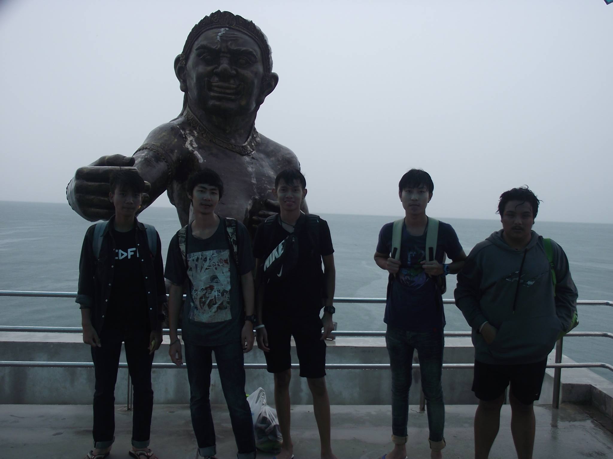 พวกเราซื้อมานั่งกินกัน แย่งกันกินแบบเอร็ดอร่อย 555+ กินอิ่มแล้วพวกเราก็โทรเรียกเรือให้มารับ ทางนั้นเขาบอกว่า 13:00 จะมารับที่ท่าเรือหน้าด่าน ช่วงเวลานั้นฝนตกปรอยๆ พวกเรานั่งรถโดยสารบนเกาะ ไปลงที่ท่าเรือหน้าด่าน. พอถึงท่าเรือหน้าด่านแล้ว พวกเราก็นั่งรอเรือให้มารับ ระหว่างรอก็ไปถ่ายรูปกัน ท่าเรือหน้าด่าน จะเป็นเหมือนอุโมงค์ทางเข้าใหญ่ มีผีเสื้อสมุธรยืนอยู่กลางทะเล ยื่นมือมาเหมือนไม่อยากให้พวกเรากลับกัน.