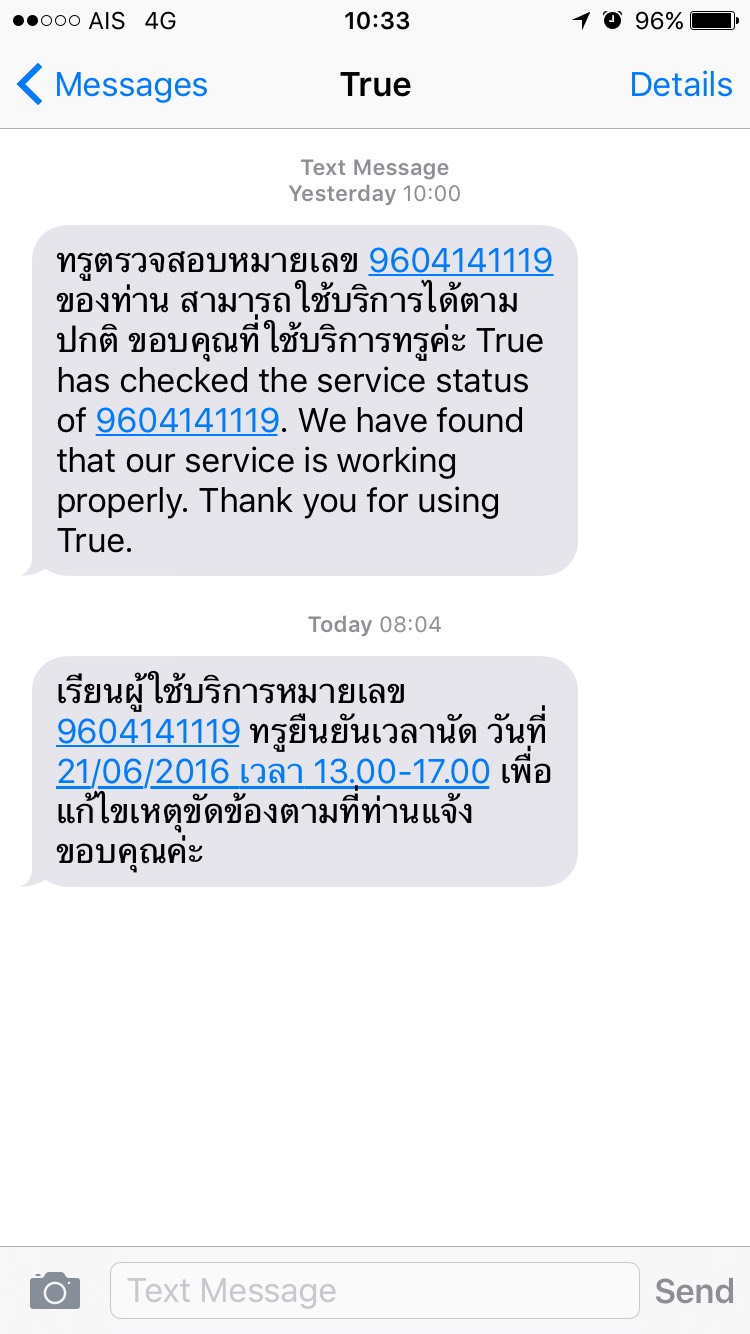และวัน 21/6/59 8:40 ก็มี sms ส่งมาบอกว่าจะมีเจ้าหน้าที่มาแก้ไข 13:00 - 17:00