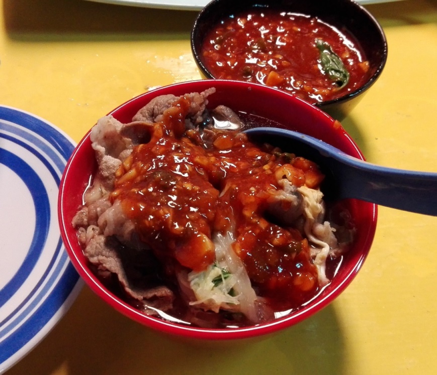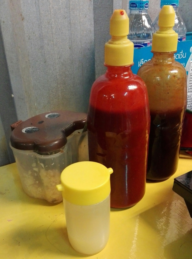 เริ่มจากน้ำจิ้มครับ สีแดงเป็นแบบเผ็ดและออกเค็ม ส่วนสีน้ำตาลรสหวาน และก็มีกระปุกมะนาว กระเทียม พริกสดตามสเตปที่เจอในทุกร้าน
