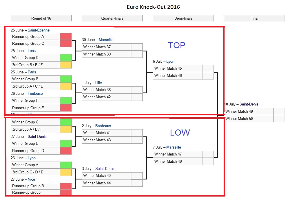 จะเห็นว่า เส้นทางในรอบ 16 ทีม จนถึงนัดชิงชนะเลิศจะถูกกำหนดไว้แล้วว่า หากเข้ารอบในอันดับใด จะถูกกำหนดให้อยู่ในไลน์นั้นไปตลอด