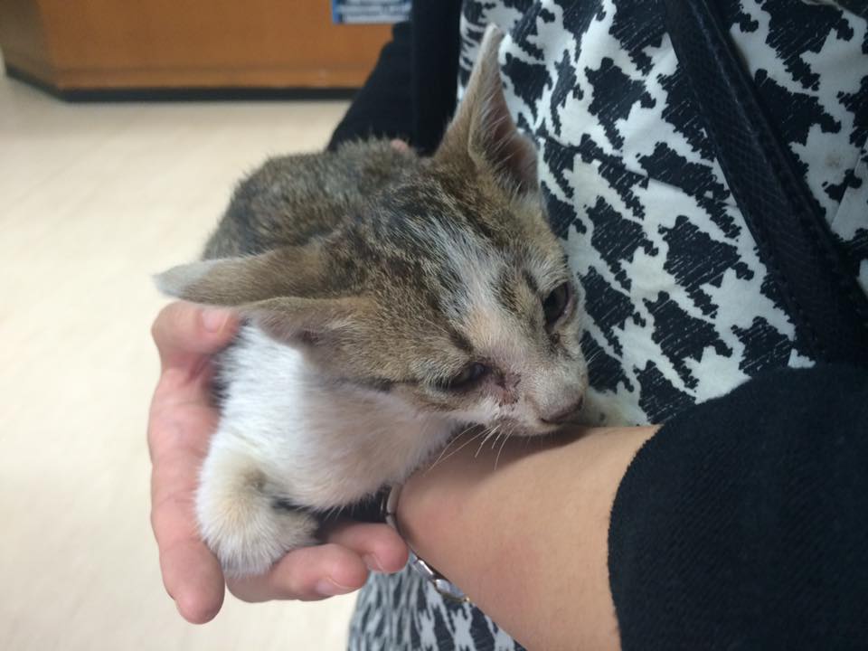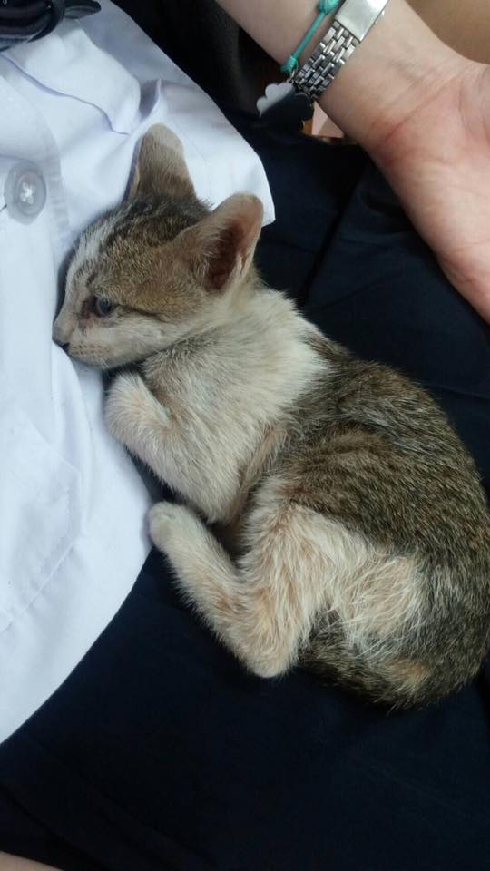 เพื่อนๆกับผมได้เจอลูกแมวกลางถนน (ตรงถนนนิมมาน) ครับ มันกระโดดออกมาจากใต้ท้องรถระหว่างขับรถอยู่ครับ มีพี่ที่ขับมอเตอร์ไซค์มาเห็นแล้วบอกก็เลยช่วยกันจับลูกแมว (ตอนแรกมี 2 ตัว อีกตัวนึงวิ่งหายเข้าไปในโรงเรียนเหมือนโรงเรียนอนุบาล) ทีนี้พี่ที่ขับมอเตอร์ไซค์ก็เอาลูกแมวมาแล้วบอกให้หาคนเลี้ยงให้หน่อยแบบงงๆแล้วก็ขับไปครับ