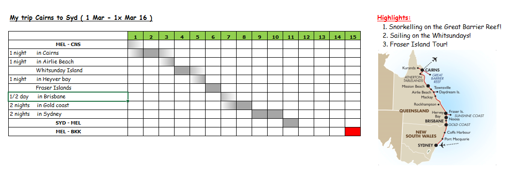 การเดินทางครั้งนี้ เกิดจากการตั้งเป้าหมายไว้ว่า ไหน ๆก็ได้มีโอกาสมาเรียนภาษาที่ Melbourne บวกกับอยากออกเดินทางคนเดียวกับเขาบ้าง จะได้เพิ่มประสบการณ์และความกล้าให้ตัวเอง ก็เลยตัดสินใจว่าต้องเที่ยวทริปยาว ๆก่อนกลับบ้านสักครั้ง เลยเริ่มวางแพลนเที่ยว ซึ่งได้ออกมาหน้าตาออกมาประมาณนี้