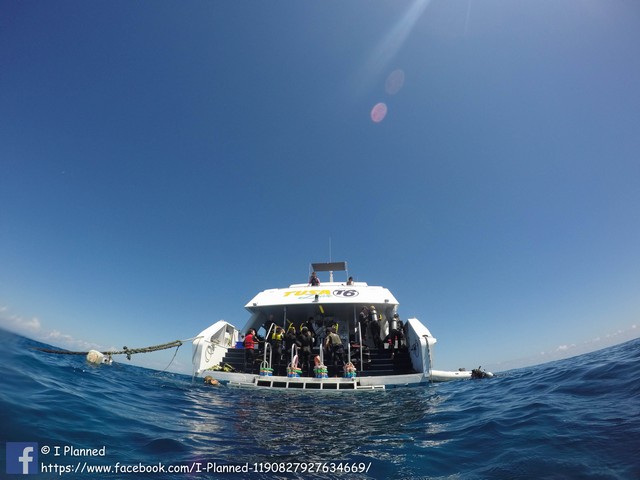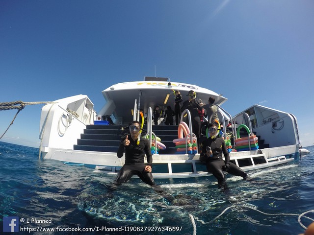 ผมรีบตื่นแต่เช้า เก็บข้าวของเตรียม check out และฝากกระเป๋าไว้ที่ล็อกเกอร์ของที่พัก เดินออกมารอรถจากบริษัททัวร์มารับหน้าที่พักตอน 7 โมงเช้า ขึ้นรถได้ประมาณ 5 นาที ก็ถึงท่าเรือแล้ว สำหรับวันนี้ผมซื้อ day trip with introductory diving ไว้ราคา $275 แพงเอาเรื่องอยู่เหมือนกัน หลังจากขึ้นเรือแล้วด้วยความที่กลัวเหงาเพราะฝรั่งส่วนใหญ่จะมาเป็นกลุ่ม ผมเลยรีบมองหาเพื่อนก่อนเลย แต่คนที่มาคนเดียวส่วนมากจะเป็นคนเอเชีย ก็เลยได้เพื่อนคนจีน โคลัมเบีย เกาหลี มาคุยแก้เขิน และในระหว่างทางที่เรือกำลังแล่นไปจุดดำน้ำ สต๊าฟก็ให้แบ่งกลุ่มตามคอร์สที่เราเลือกไว้ และทำการสอนดำน้ำภาคทฤษฎีให้ก่อน