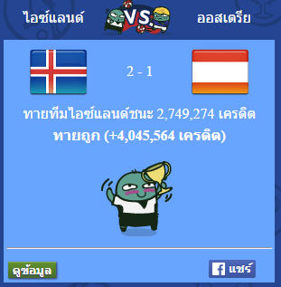 ไอซ์แลนด์ชนะ 2 ล้านกว่า คู่นี้ดูสด พอทดเจ็บนาทีที่ 3 กว่าๆ เฮดังมาก ไอซ์แลนด์สวนยิงตูมแล้วจบเกมเลย