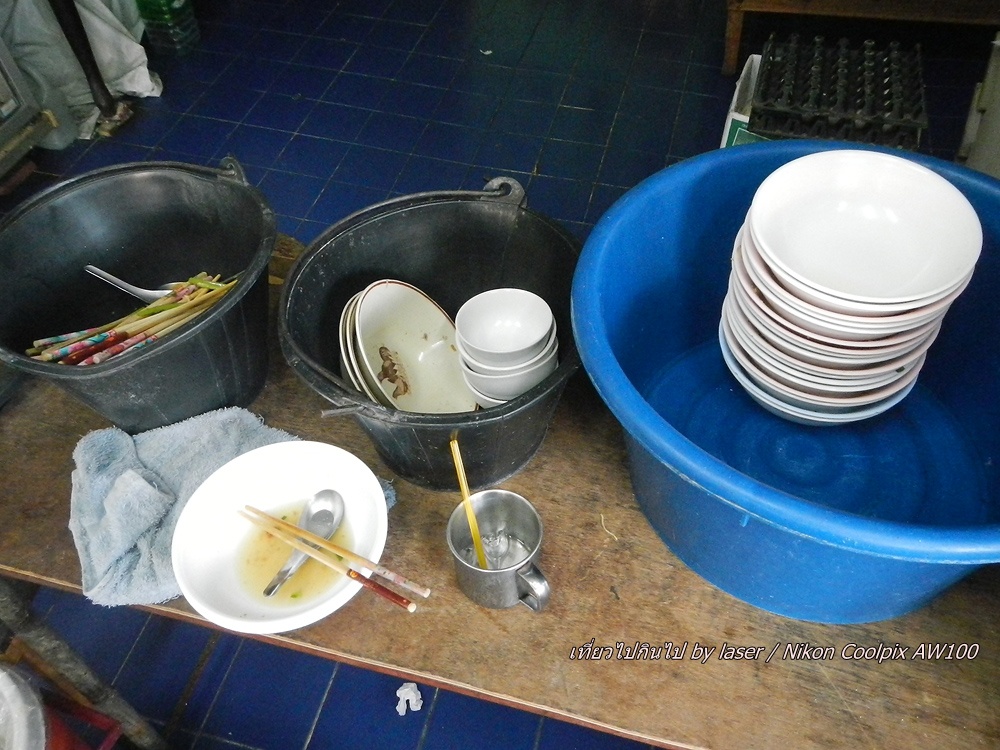 กินเสร็จยกถ้วยชามไปวางใส่ถังและกาละมัง โดยแยกชามกับตะเกียบและช้อน