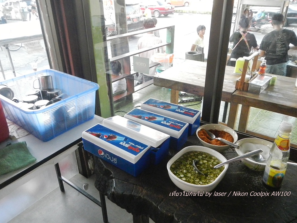มุมซ้ายวางถังน้ำแข็งให้ตักเอง ติดกับโต๊ะวางช้อน ตะเกียบและเครื่องปรุง
