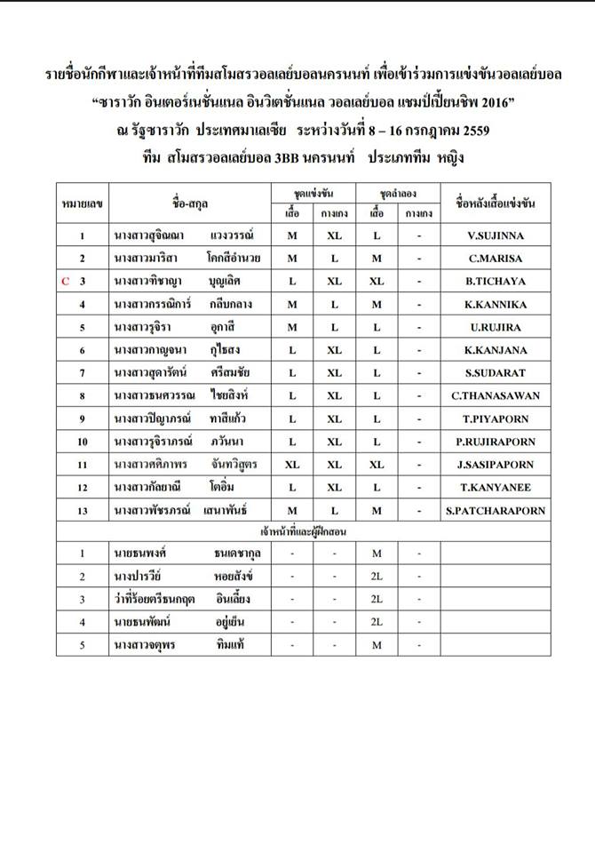 รายชื่ออย่างเป็นทางการของทีม นครนนท์3BB เข้าแข่งรายการที่มาเลเซีย