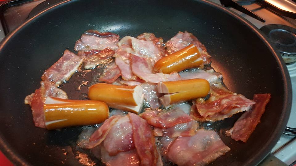 ตั้งกระทะให้ร้อน นำเบคอนที่หั่นเตรียมไว้ลงไปทอด ถึงตอนนี้จะมีน้ำมันจากเบคอนออกมา ใช้น้ำมันจากเบคอนทอดพริก กระเทียมต่อเลยค่ะ จะหอมมาก ไม่ต้องใส่น้ำมันเพิ่มแล้วค่ะ