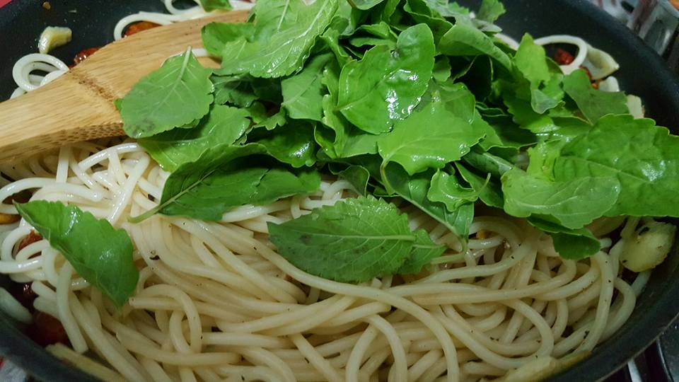 สุดท้ายใส่ใบกระเพรา ตักเสริฟค่ะ