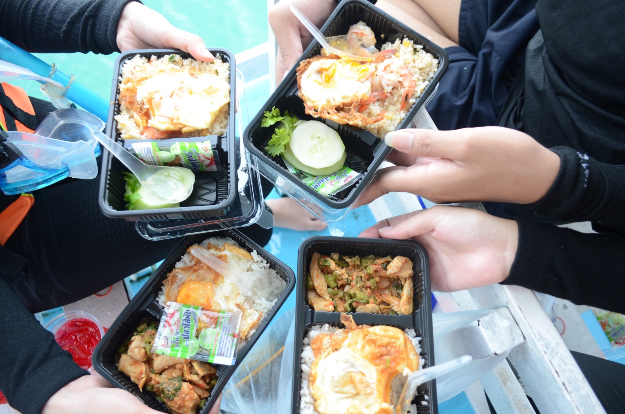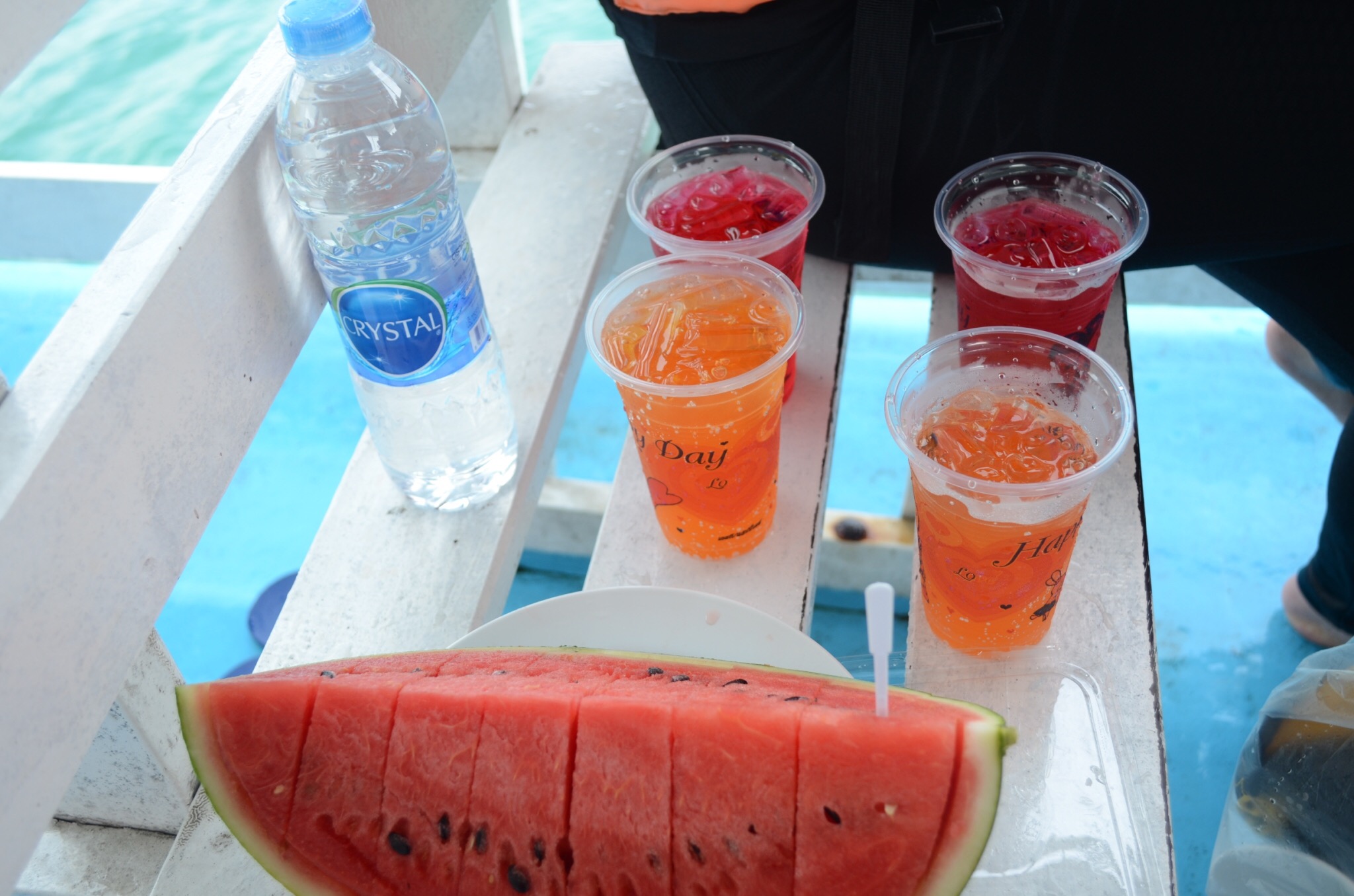พอดำน้ำจนพอใจเราก็มาขึ้นเรือและไปรับข้าวกล่อง ขนม แตงโม เครื่องดื่มต่างๆ เลือกได้ตามใจชอบ เราสนุกกันมากจนไม่ได้ดูเวลา