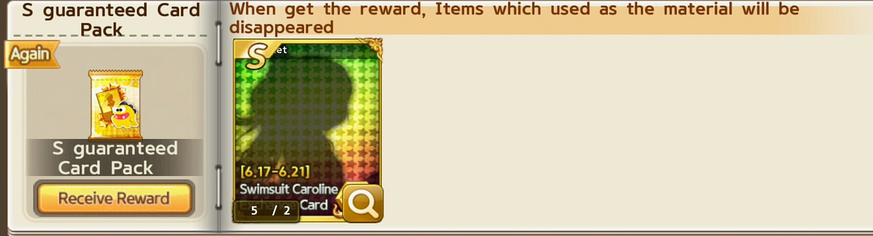 ทุกวันจะได้รับการ์ดเงาพิเศษแคโรไลน์ชุดว่ายน้ำ S ครบ 5 ใบสามารถแลกแคโรไลน์ชุดว่ายน้ำS+ 1 ใบ