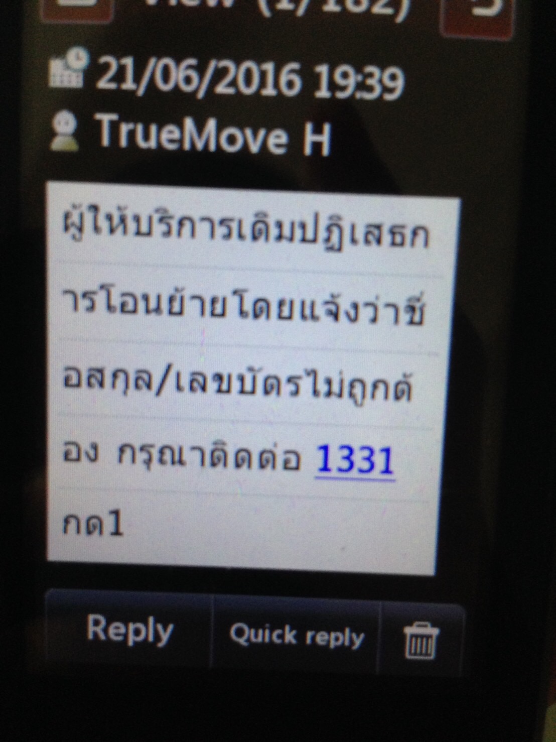 ก็ได้มี sms ตอบกลับมาจากทรูว่า "ผู้ให้บริการเดิมปฏิเสธการโอนย้าย โดยแจ้งว่า ชื่อสกุล/เลขบัตรไม่ถูกต้อง กรุณาติดต่อ 1331 กด 1"