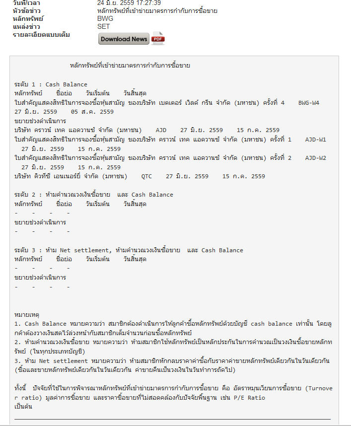 ตลท ประกาศวันนี้ bwg-w4 โดน Cash Balance Account 27/6 - 5/8/2559 ส่วนตัวแม่ bwg รอด ในข้อ มี <PE40