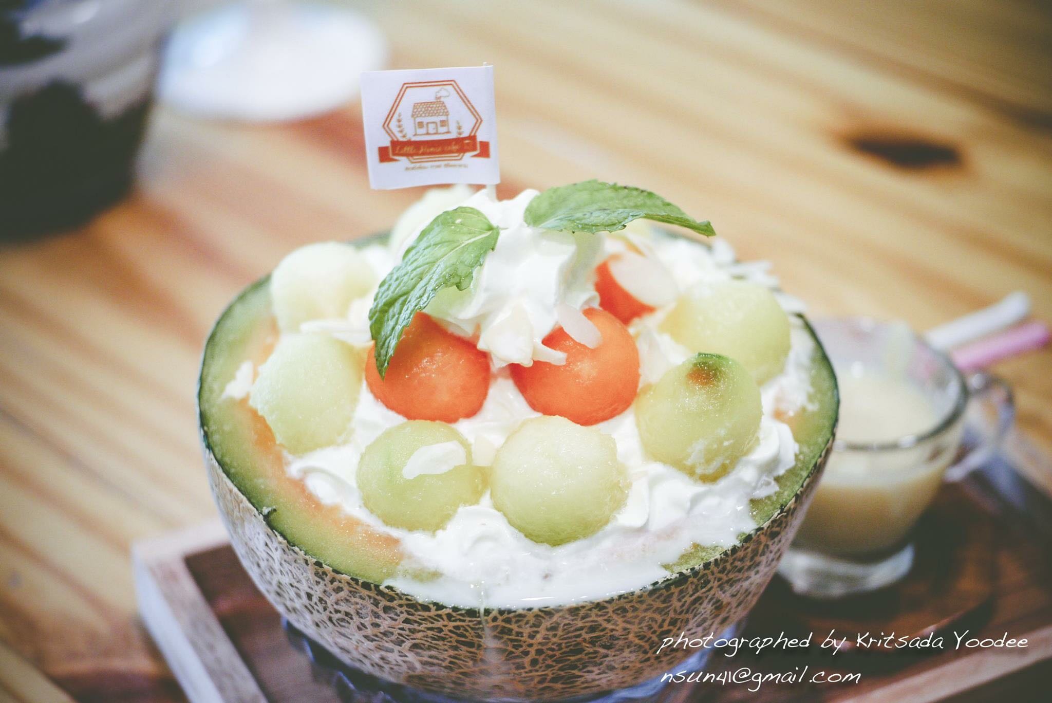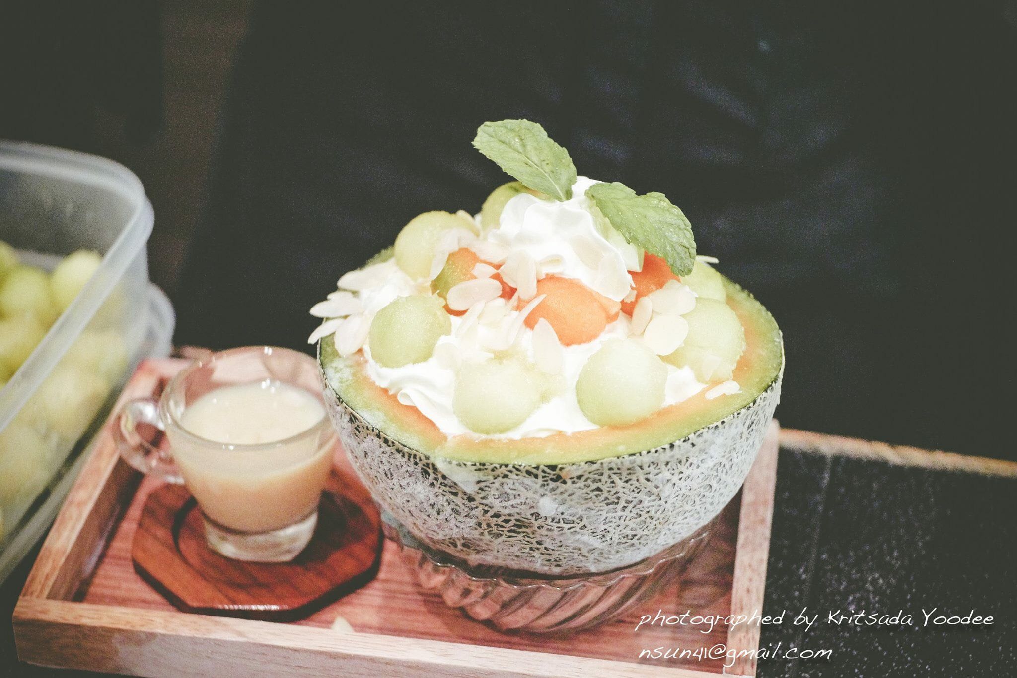 และ ค่อยค่อยนำนม มา ปั่นจนเป็นเก็ทหิมะแล้วค่อยค่อยดับแคนตาลูปแต่ละลูกมาวางเรียงเป็นวงกลมสูงขึ้นไป แล้วโรยด้วยเมล็ดฟักทอง. เสิร์ฟพร้อมกับนมข้นอีกถ้วยหนึ่ง รสชาดหอมหวานมากครับเหมือนกำลังกินน้ำผึ้งอยู่เลยยิ่งเพลทมงคลลงไปอีกความอ่อนหวานมันก็เพิ่มมากขึ้นทวีคูณภาพความอร่อยสูงสู่จุดสูงสุด