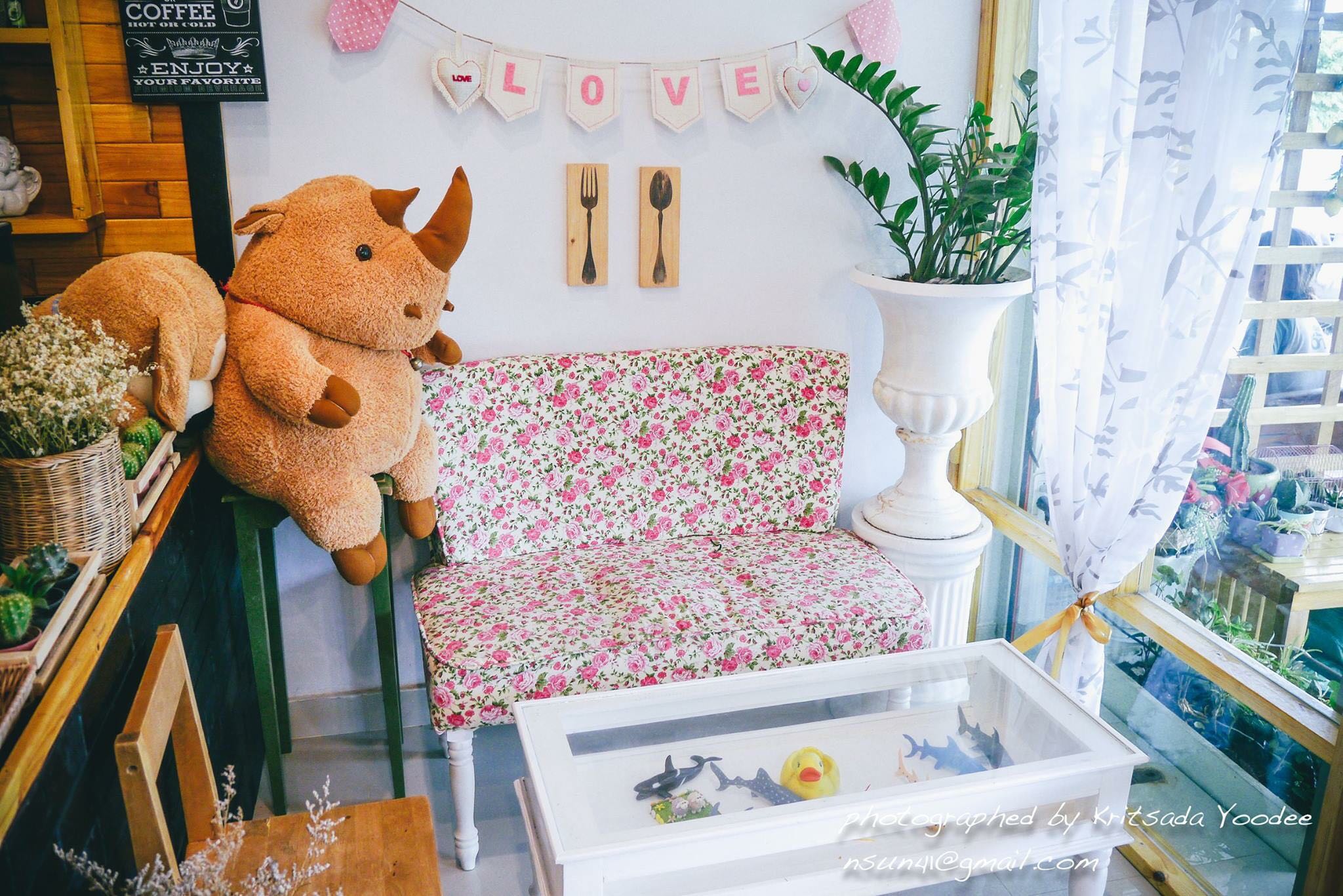 รักนี้จัดร้านแบบสไตล์บ้านบ้านน่ารักดีเป็นร้านขนาดเล็กหนึ่งคูหาภายในร้านตกแต่งด้วยดอกไม้แห้งโต๊ะไม้ ขนาดน่ารักน่ารักมีเคาน์เตอร์ขนาดใหญ่ไว้สำหรับทำอาหารส่งกาแฟให้กับลูกค้าภายในร้าน