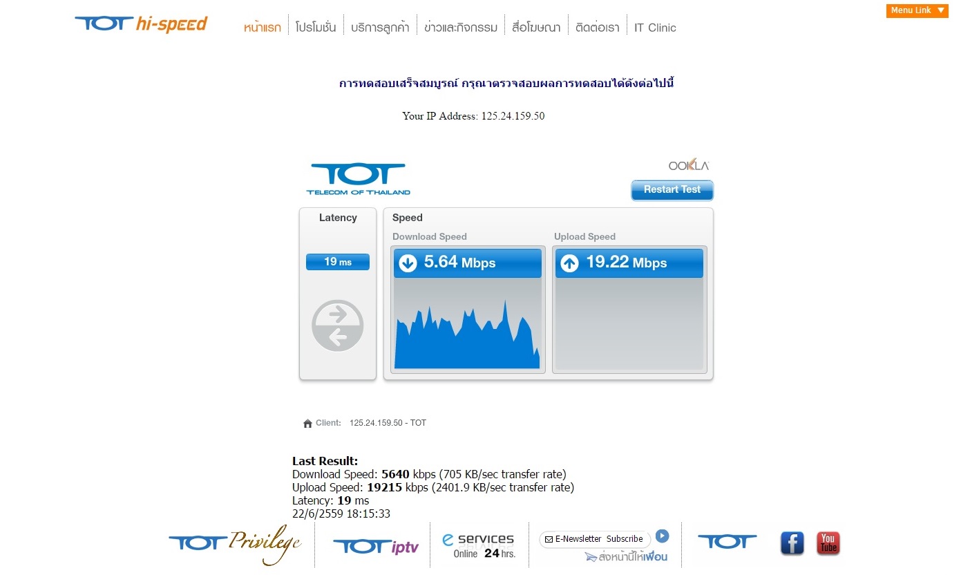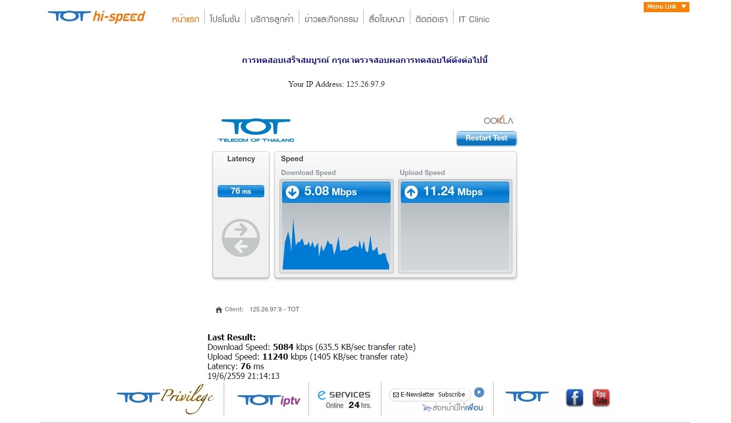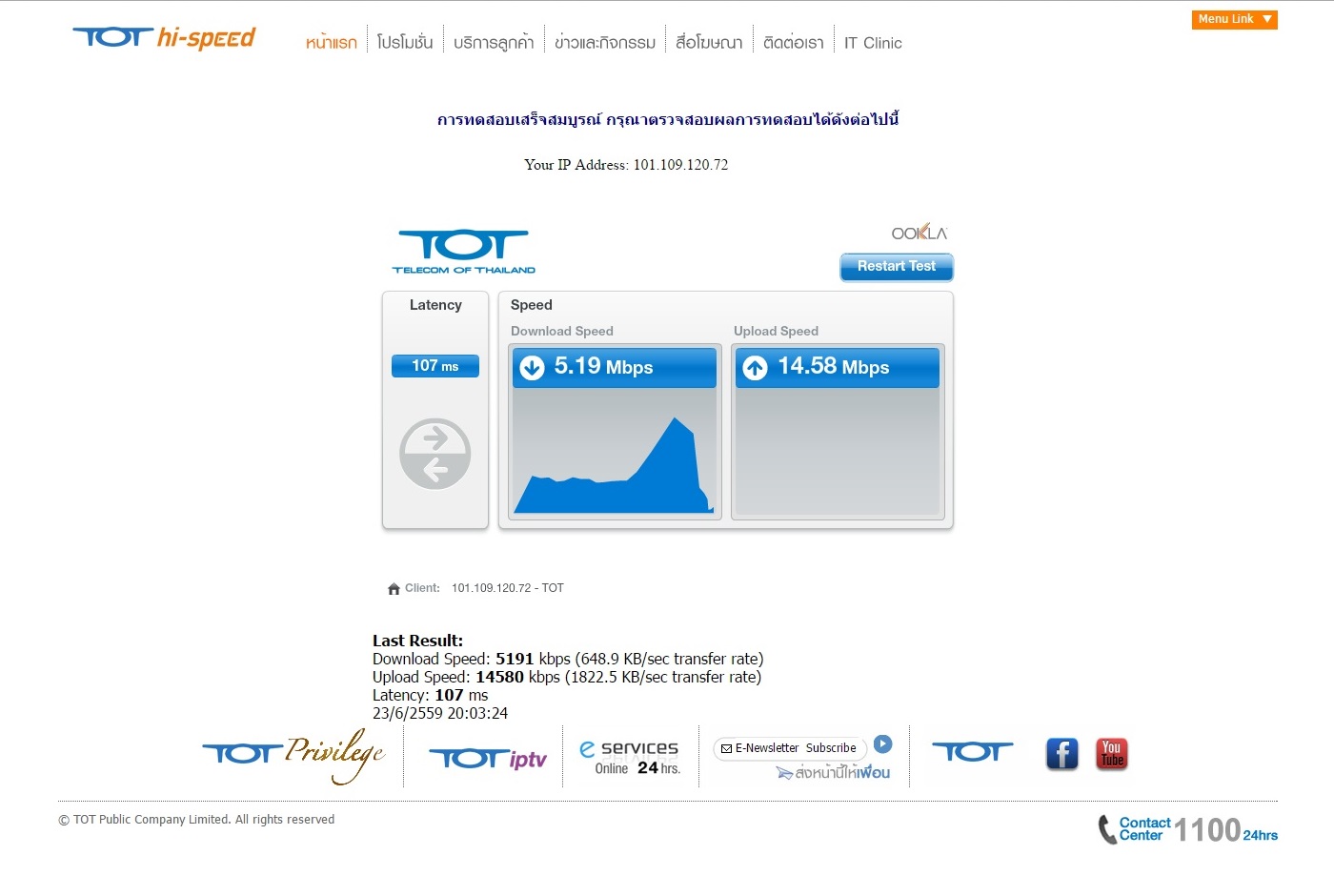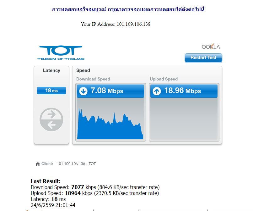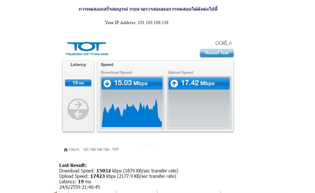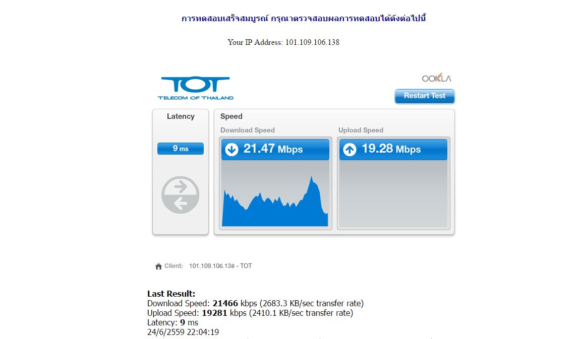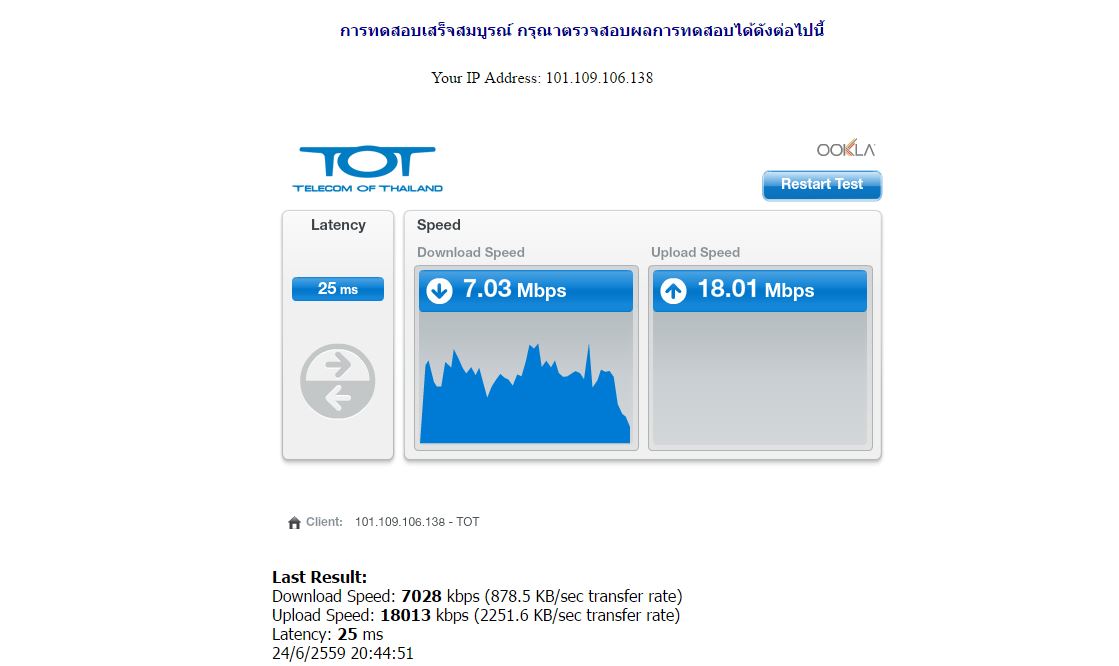 ใช้งานที่ระยอง เป็นมาตั้งแต่วันที่ 18/6/59 เลย ความเร็วจาก 35/15 เหลือต่ำสุด 5 mb ช่วง 2-4 ทุ่ม โปรนี้เพิ่งไปขอเพิ่มสปีดมา เซ็นสัญญาใหม่ ก่อนหน้านั้นใช้ 20/10 ยังไม่เคยมีปัญหาเลย พอมีปัญหาโทรแจ้ง tot callcenter ตั้งแต่วันแรกที่เป็นยันวันล่าสุด วันที่ 23/6/59 ก็ยังไม่หาย วันที่ 20/6/59 เลยไปที่ศูนย์บอกไม่ไหวแล้วทำอะไรไม่ได้เลยเพราะเล่นหนักๆก็ช่วงนี้แหละ 2-4 ทุ่ม ตอนแรก จนท.แนะนำว่าให้เปลี่ยนกลับไปใช้โปรเดิม คือ 20/10 ผมเลยบอกไปว่า ถ้าผมกลับไปใช้โปรเดิม ผมขอสัญญาเก่าผมคืน ซึ่งจะหมดในเดือน 11/59 ถ้าจำไม่ผิด แต่ จนท.ดันบอกไม่ได้ แบบนี้ เหมือนกับให้ผมเซ็นสัญญาต่ออายุไปฟรีๆเลย เขาเลยให้ผมคุยกับผู้จัดการ ผู้จัดการ โทรไปหาช่างถามประมาณว่าทำอะไรได้บ้าง เขาเลยย้าย อะไรสักอย่างของผมไปอยู่ชลบุรี พอย้ายแล้ว ผู้จัดการโทรมาบอกว่าย้ายไปให้แล้ว กลับมาสปีดปกติ แค่วันเดียววันที่ 21/6/59 วันที่ 22/6/59 เป็นอีกแล้ว อาการเดิมๆเลยคือสปีดตก ตอน 2-4 ทุ่ม ผมโทรแจ้ง callcenter วันรุ่งขึ้นโทรกลับมาปิดงานบอกให้ลองใช้งานดูก่อน บอกผมแบบนี้ทุกวันที่ผมโทรแจ้งให้ลองใช้งานดูก่อน บอกจนผมโมโห ผมบอกไปว่า ผมบอกไปหลายครั้งแล้วนะครับว่ามันเป็ฯตอน 2-4 ทุ่ม ล่าสุด จนท. ยังไม่ได้ปิดงานเคสของผม แต่ไม่รู้จะแก้ได้ไหม อย่างน้อยบอกแนวทางการแก้ไขหรือโทรมาแจ้งผมสักนิดว่าแก้ไขให้อะไรยังไงก็ยังดี ไม่ใช่จะโทรมาปิดงานอย่างเดียว