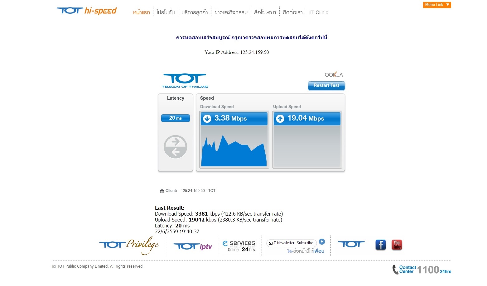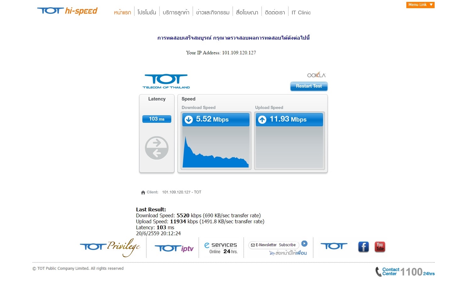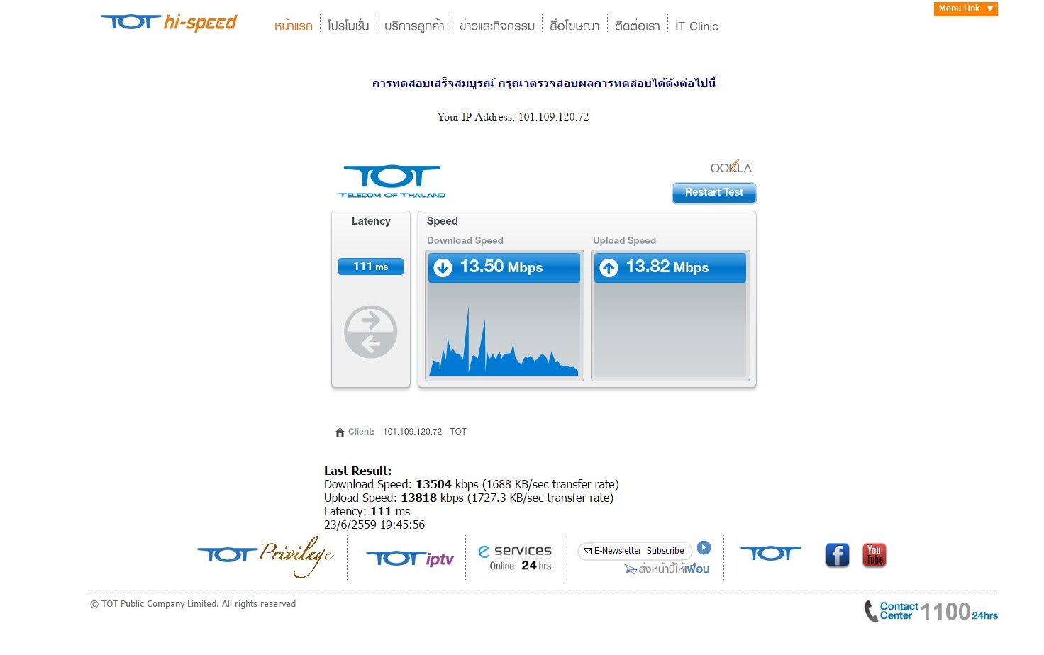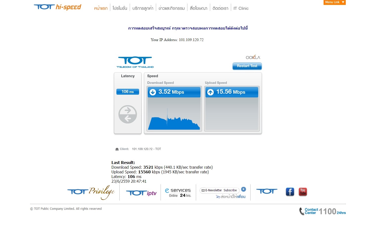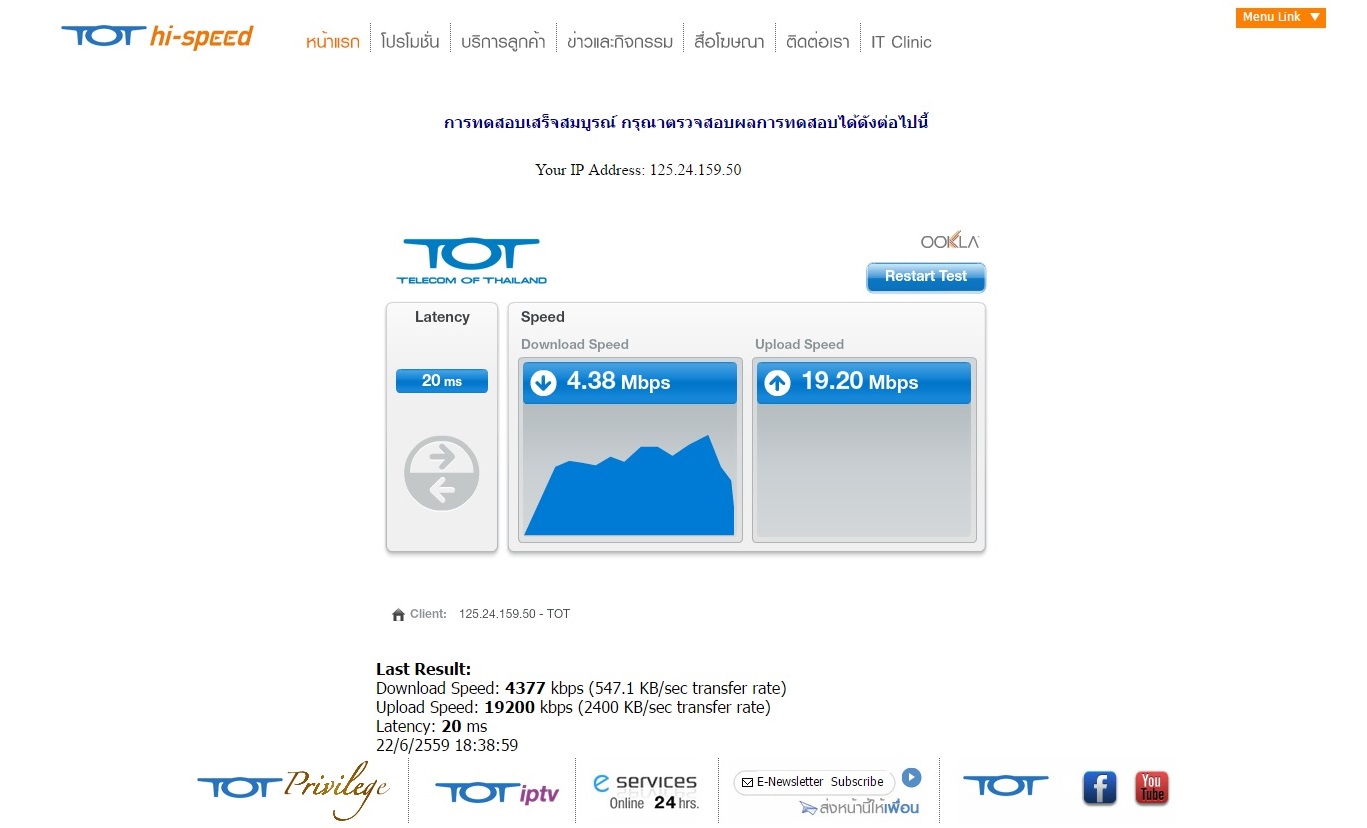 ใช้งานที่ระยอง เป็นมาตั้งแต่วันที่ 18/6/59 เลย ความเร็วจาก 35/15 เหลือต่ำสุด 5 mb ช่วง 2-4 ทุ่ม โปรนี้เพิ่งไปขอเพิ่มสปีดมา เซ็นสัญญาใหม่ ก่อนหน้านั้นใช้ 20/10 ยังไม่เคยมีปัญหาเลย พอมีปัญหาโทรแจ้ง tot callcenter ตั้งแต่วันแรกที่เป็นยันวันล่าสุด วันที่ 23/6/59 ก็ยังไม่หาย วันที่ 20/6/59 เลยไปที่ศูนย์บอกไม่ไหวแล้วทำอะไรไม่ได้เลยเพราะเล่นหนักๆก็ช่วงนี้แหละ 2-4 ทุ่ม ตอนแรก จนท.แนะนำว่าให้เปลี่ยนกลับไปใช้โปรเดิม คือ 20/10 ผมเลยบอกไปว่า ถ้าผมกลับไปใช้โปรเดิม ผมขอสัญญาเก่าผมคืน ซึ่งจะหมดในเดือน 11/59 ถ้าจำไม่ผิด แต่ จนท.ดันบอกไม่ได้ แบบนี้ เหมือนกับให้ผมเซ็นสัญญาต่ออายุไปฟรีๆเลย เขาเลยให้ผมคุยกับผู้จัดการ ผู้จัดการ โทรไปหาช่างถามประมาณว่าทำอะไรได้บ้าง เขาเลยย้าย อะไรสักอย่างของผมไปอยู่ชลบุรี พอย้ายแล้ว ผู้จัดการโทรมาบอกว่าย้ายไปให้แล้ว กลับมาสปีดปกติ แค่วันเดียววันที่ 21/6/59 วันที่ 22/6/59 เป็นอีกแล้ว อาการเดิมๆเลยคือสปีดตก ตอน 2-4 ทุ่ม ผมโทรแจ้ง callcenter วันรุ่งขึ้นโทรกลับมาปิดงานบอกให้ลองใช้งานดูก่อน บอกผมแบบนี้ทุกวันที่ผมโทรแจ้งให้ลองใช้งานดูก่อน บอกจนผมโมโห ผมบอกไปว่า ผมบอกไปหลายครั้งแล้วนะครับว่ามันเป็ฯตอน 2-4 ทุ่ม ล่าสุด จนท. ยังไม่ได้ปิดงานเคสของผม แต่ไม่รู้จะแก้ได้ไหม อย่างน้อยบอกแนวทางการแก้ไขหรือโทรมาแจ้งผมสักนิดว่าแก้ไขให้อะไรยังไงก็ยังดี ไม่ใช่จะโทรมาปิดงานอย่างเดียว