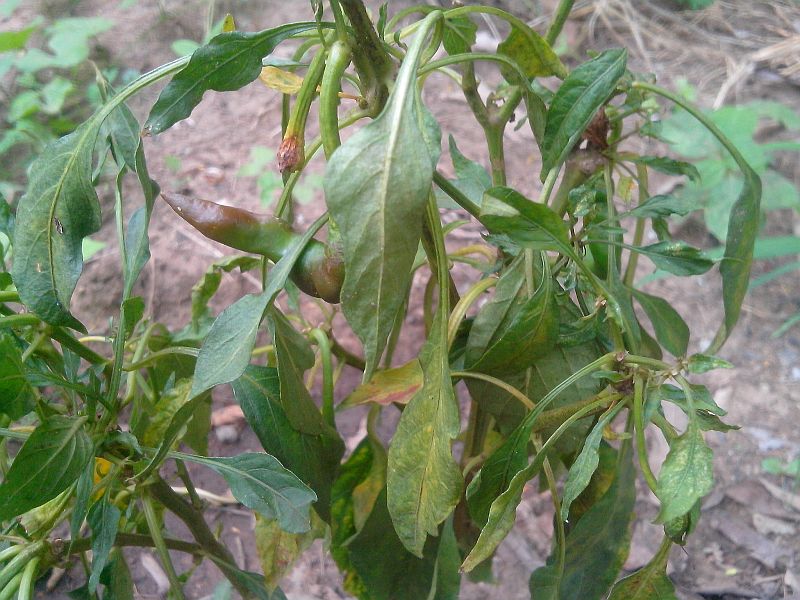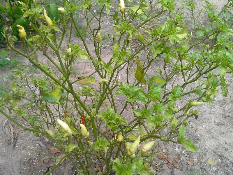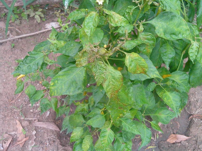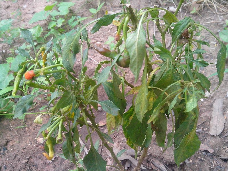 ต้นพริกปีศาจครับ แดดเกือบทั้งวัน มีร่มเงาของต้น สะระแหน่ข้างๆบ้าง ใบหงิกๆบ้าง ร่วงบ้าง ตอนแรกนึกว่าเพลี้ย ฉีดยาฆ่าแมลงไปแล้ว ใบก็ยังค่อยๆร่วงครับ ผมสันนิษฐานดังนี้ ๑ ดินแฉะไป (ให้ยากันรากเน่าแล้วไม่ด