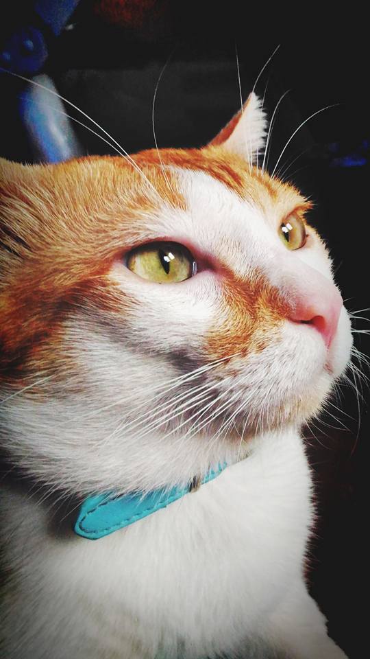 แมวผมตั้งชื่อให้ว่า "เจ้าแต้มทอง" มีปลอกคอสีฟ้า