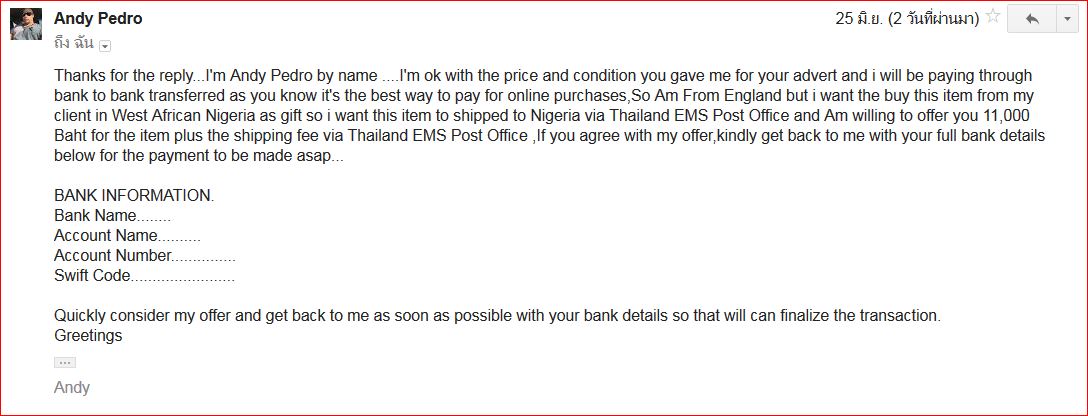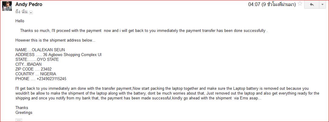 ผมโพสขายโนตบุคในตามเวปไทยมาได้ระยะนึง แล้วก็มีเมล์จาก Andy Pedro <andy.pedro016@gmail.com> มาถามราคา ผมตั้งไว้ 7500 แต่แกจะให้ถึง 11,000 แต่ให้ส่งไปไนจีเรีย พอดีเคยรู้มาบ้างไม่คิดว่าจะโดนกะตัวเอง เลยลองเล่นกับเค้าดู