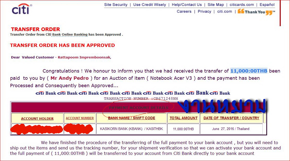 แม่เจ้า มันโอนเข้ามาในเลขบัญชีมั่วๆได้ด้วย แต่งานหยาบมาก ผมเลยแกล้งบอกว่า เงินไม่เข้าบัญชีผมเลย มียอด 894,278.42 เท่าเดิม (แกล้งมั่วเลขอีก ให้มัน Grand ไว้ก่อน)