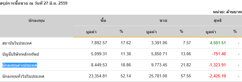 Sinthorn Summary 27/6/2559 : ต่างชาติขายสุทธิ -1,323.91 ลบ.