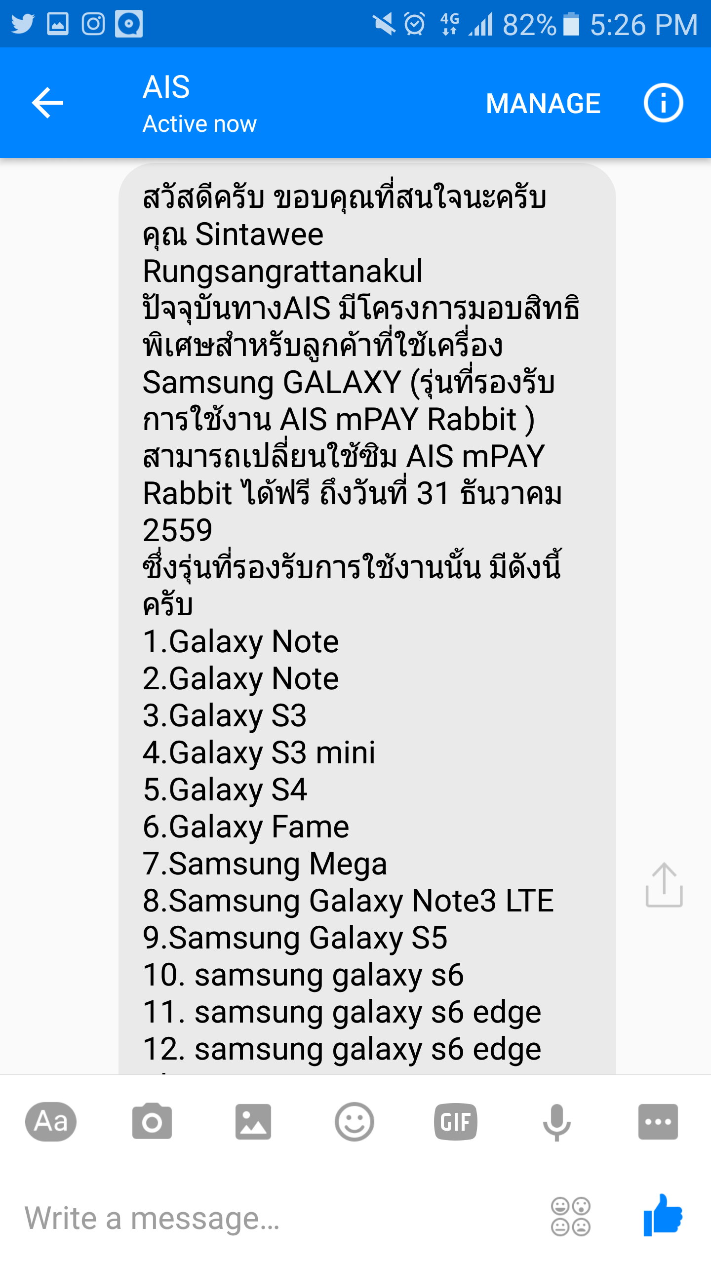 อยากสอบถามว่า เมื่อไหร่ AIS จะให้ smartphone ยี่ห้ออื่นๆ นอกจาก samsung ได้ใช้ บริการ AIS mPay Rabbit sim ซักที ตอนนี้ เทคโนโลยี NFC หลาย brand ก้อทำแล้ว Nokia ทำมาก่อน samsung อีก Iphone6 ก้อจะมีแล้ว