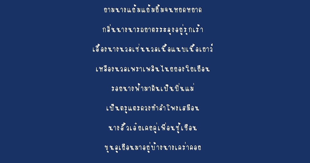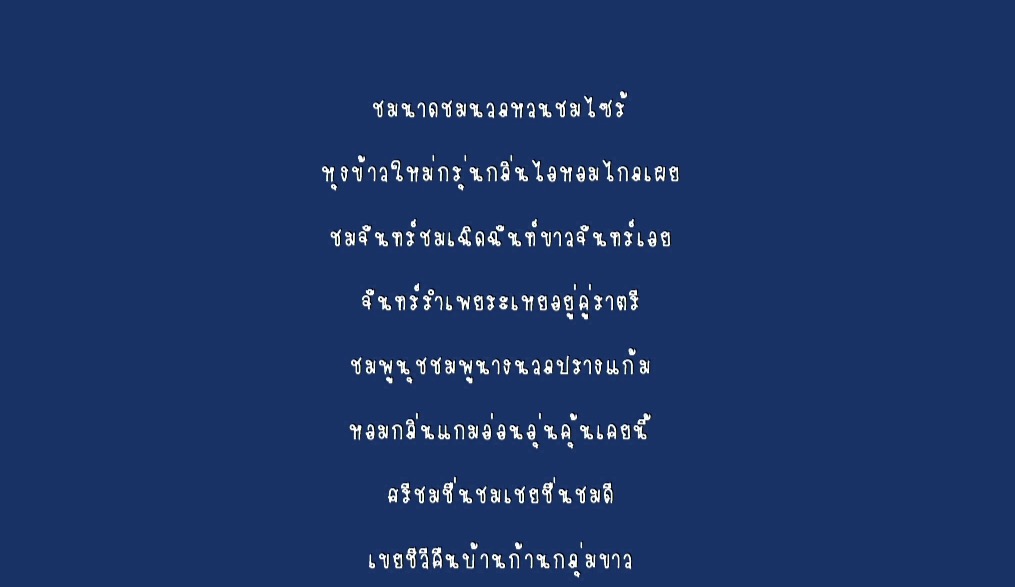 ยลเกลียวคลื่น ตื่นตัว ระรัวฝั่งส่งเสริมพลัง จากลม ปรารมภ์เหลิงภุมร์แสดง แว้งเวียน เฉวียนเริงกระเจิดเจิง บินว่อน โฉบร่อนรำ"ล้อมดอกไม้ พนอ เคล้าคลอสู้นกขันคู ลั่นไพร คราใกล้ค่ำย่างสามขุม พุ่มหญ้า บ