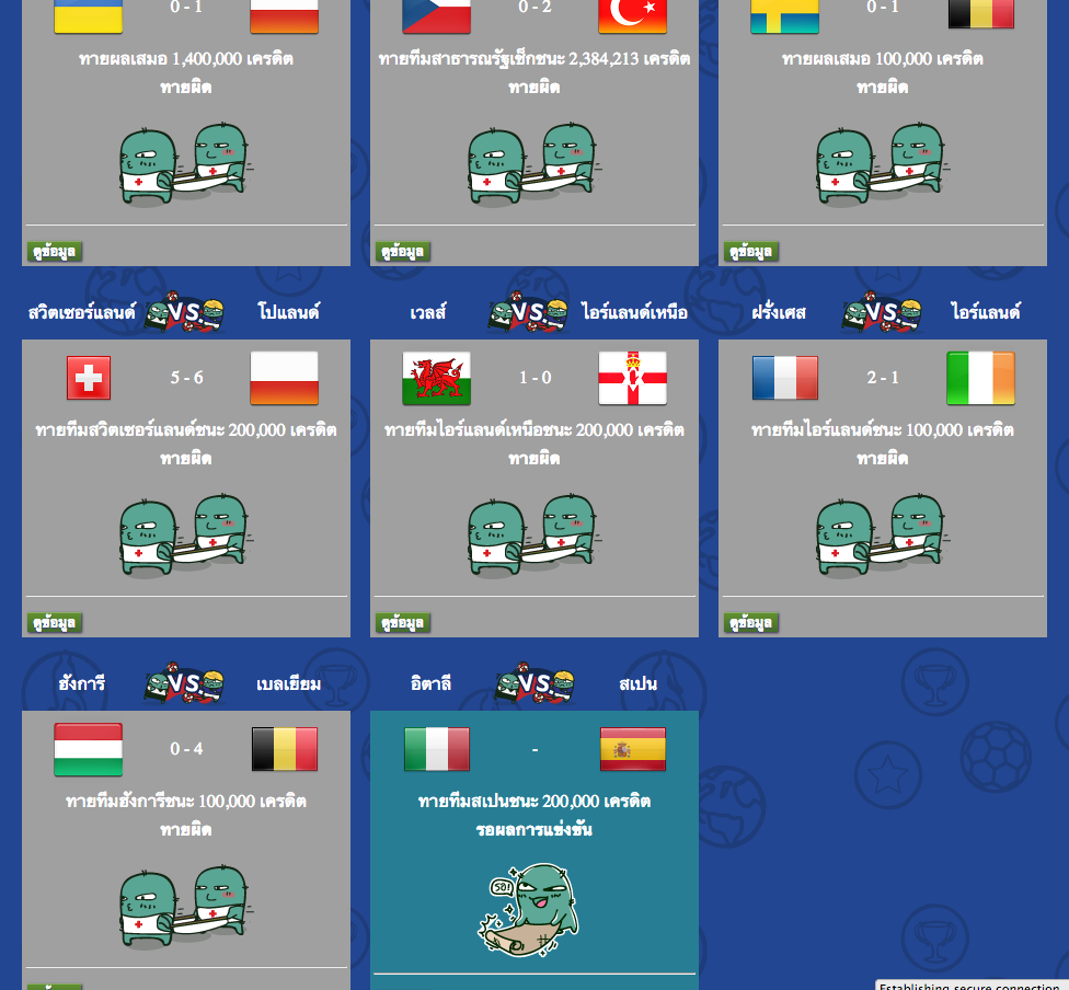 เดิมทายสเปนชนะไว้ พอเห็นประวัติ จขกท. ที่เอามาลงแล้วทายสเปน เลยตัดสินใจเปลี่ยนข้างทายอิตาลีแทน เสียดาย จขกท. ไม่ได้ลงคู่อังกฤษ - ไอซ์แลนด์