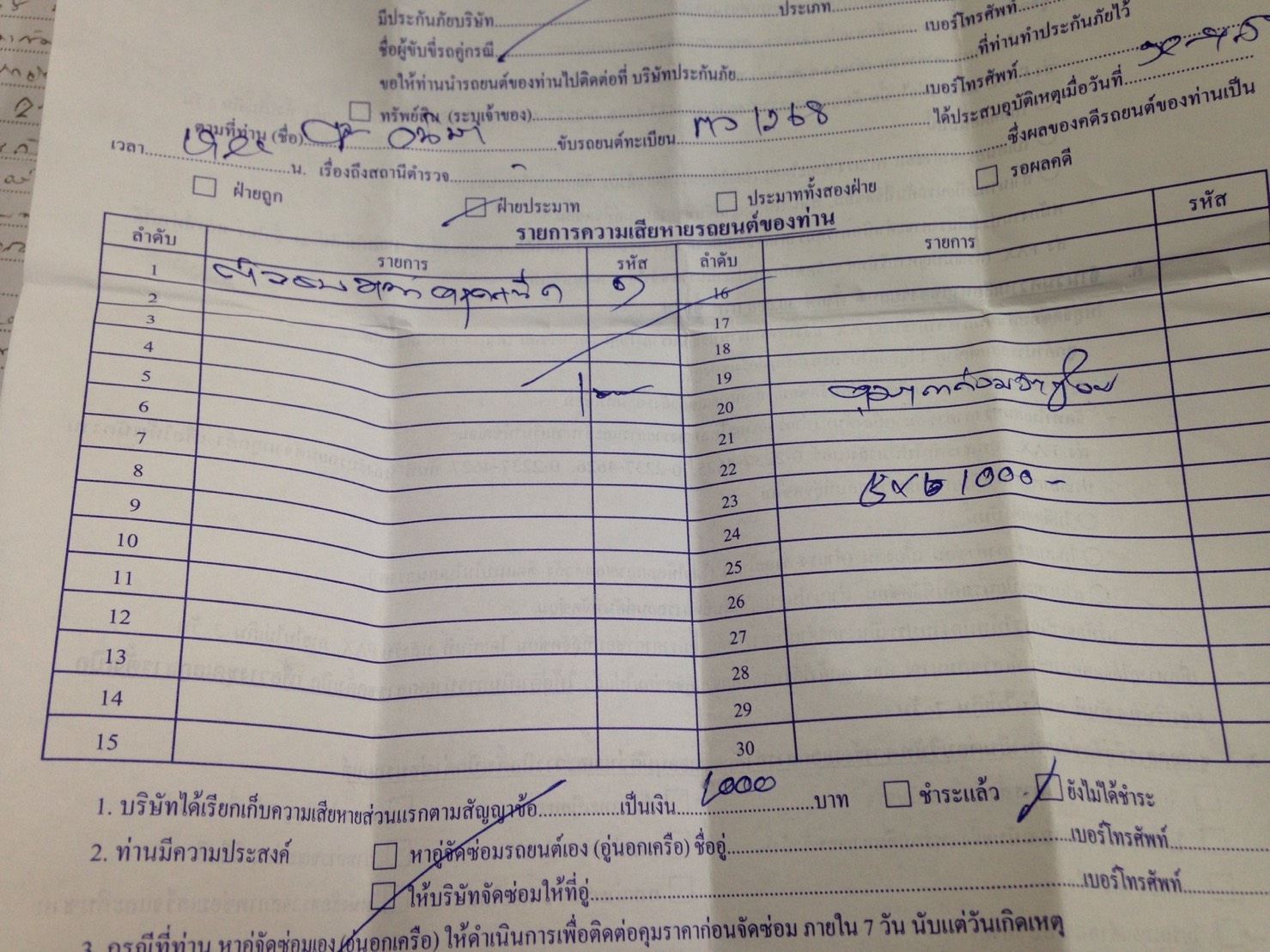 เรื่องมีอยู่ว่า เมื่อวันที่ 30 เม.ย ที่ผ่านมาจอดรถติดไฟแดงอยู่ มีมอเตอร์ไซด์วัยรุ่นขับกันมา 2 คนขับแซกรถเราไปแต่ไม่พ้นมาขูดตรงกะจังหน้ารถด้านขวาล่างเราเลยลงไปเรียกบอก น้องขูดรถพี่อะ มันดันไฟเขียวพอดีเราเลยบอกน้องไปเจอกันหน้าห้างข้างหน้า แต่มอไซด์มันดันขับไปเลยไม่ยอมจอดค่ะ เราเลยไปแจ้งความไว้เพราะจำทะเบียนรถมอไซด์ได้ (ด้วยความตกใจลืมเอามือถือถ่ายรูปไว้ โกรธตัวเองจัง) พอวันรุ่งขึ้นเลยโทรตามประกันมาเคลม แต่ประกันบอกให้เราต้องไปตามเรื่องที่ สน.เอง เราก็งงว่ามันใช่เหรอ เราลูกค้าประกันชั้น1 นะเสียค่าเบี้ยเป็นหมื่นเราต้องไปตามเรื่องคดีเองเหรอ แถมลงในใบเคลมให้เราว่าเราเป็นฝ่ายประมาณอีกตั้งหาก และลงว่าต้องจ่ายค่าเอ็กเซฟอีก 1000 บาท
