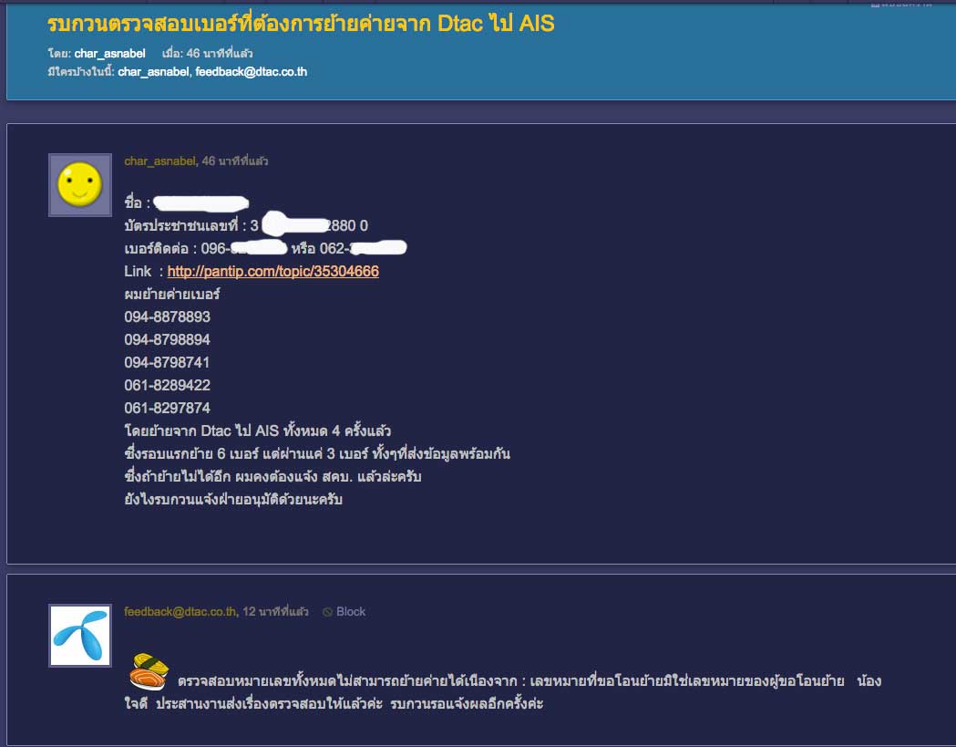 AIS ก็ตามเรื่องอยู่...ด้วยความร้อนใจจึงติดต่อ Dtac ผ่าน Pantip.com ซึ่งได้คำตอบแบบนี้