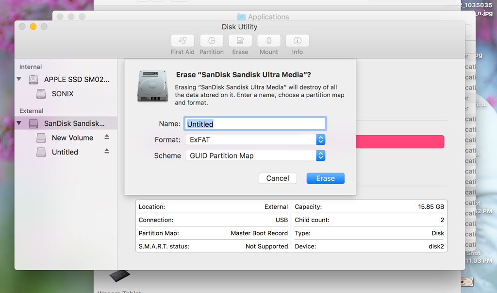 ผมเอาเครื่องแมคผมทำการฟอเมต โดยใช้รูปแบบไฟล์ แบบ exfat ตามภาพครับ