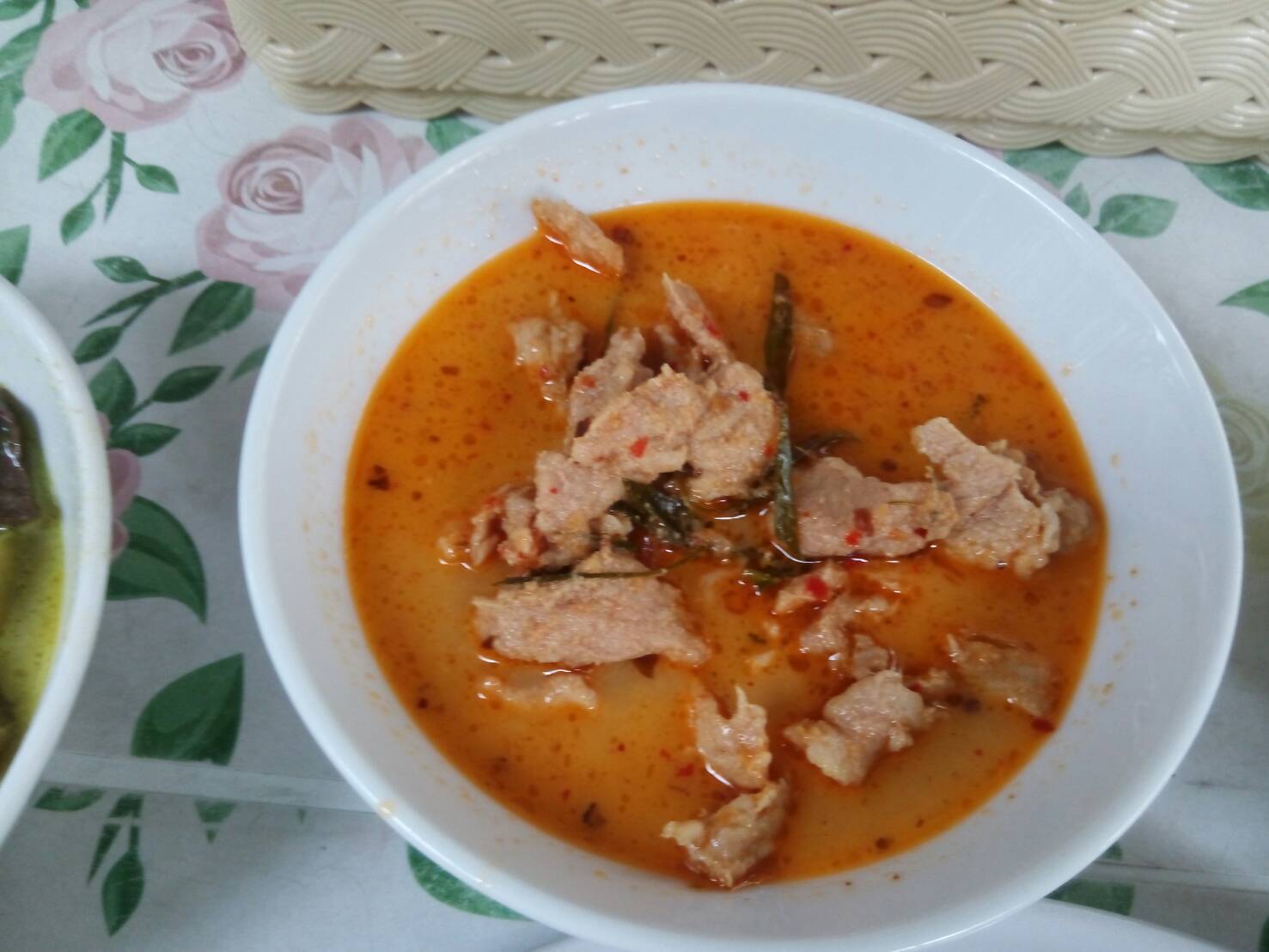 ข้าวยำส้มโอ มีเครื่องหลายอย่างดี ดูน่าเร้าใจ ข้าวหุงอัญชัน สีสวยงาม มีผักรายล้อม ส้มโอเนื้อเต่ง ๆ เปรี้ยวอมหวาน เคยกินที่แดนใต้ ไม่มีผักชีแบบนี้นะ แค่ร้านนี้มี ก็แปลก ๆ ดี น้ำยำ กลิ่นน้ำบูดูหอมดี เคี