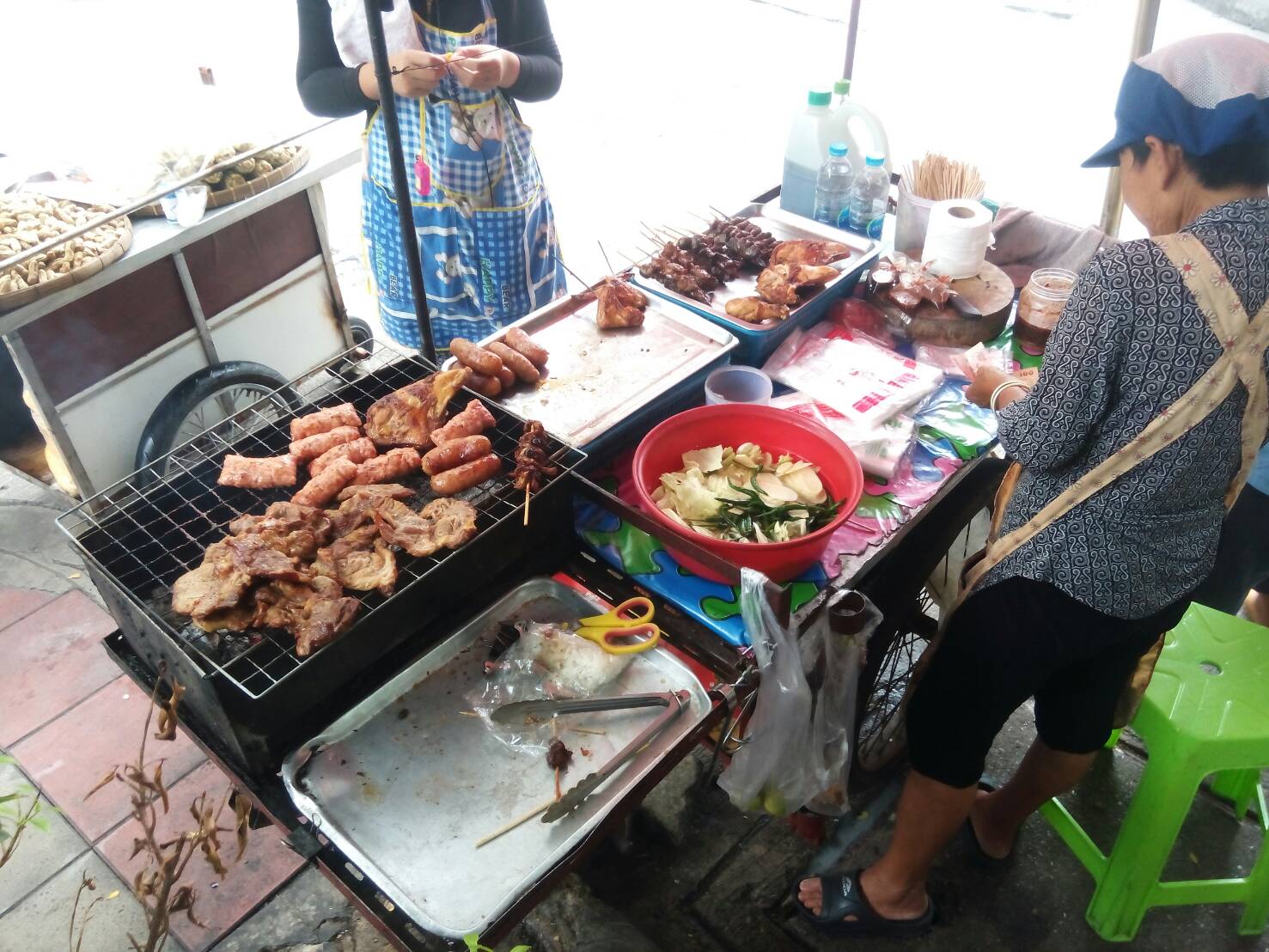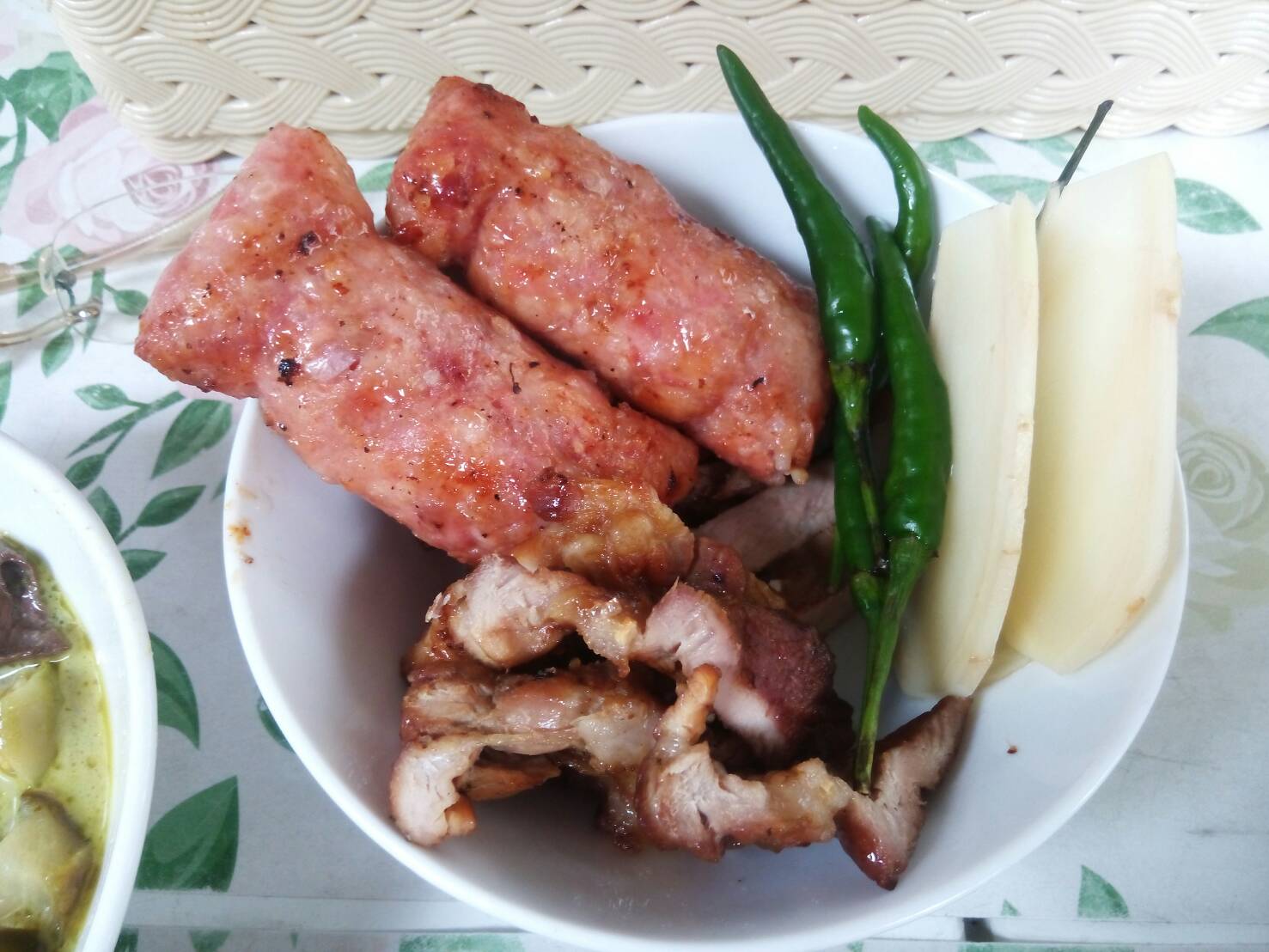 ตอนได้ของมาครบ ดูแล้วมันน้อยๆ กวาดตาไปเจอรถเข็นไส้กรอกปิ้งข้างๆร้าน เลยขอชามน้องเขามาใส่ ได้หมูย่างกับแหนมปิ้งมา