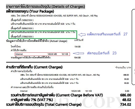 ผมใช้แพ็คเกจ AIS 4Gรายเดือน 488 บ. เน็ต 10 GB.(ตัดรอบบิลทุกวันที่ 23) ซึ่งผมไม่พอใช้ ผมจึงได้ซื้อแพ็คเกจเสริม 2 ครั้ง(99 บาท เน็ต 5 GB. นาน 7 วัน) ครั้งที่ 1 ซื้อวันที่ 13 - 20 มิถุนายนแล้วก็ยังไม่พอใช้ ผมจึงได้ซื้อแพ็คเกจเสริมครั้งที่ 2 เริ่มวันที่ 20 - 27 มิถุนายน