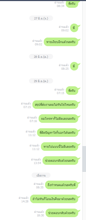 " พี่ ไม่ อ่าน ไลน์ ผม เลย นะ ครับ " "ยังไงช่วยโอนเงินคืนมาด้วยนะครับ" เต็มๆ หลังจากนั้น คำตอบ , ข้อแก้ตัว , ข้ออ้าง ก็ประดาเข้ามาในไลน์