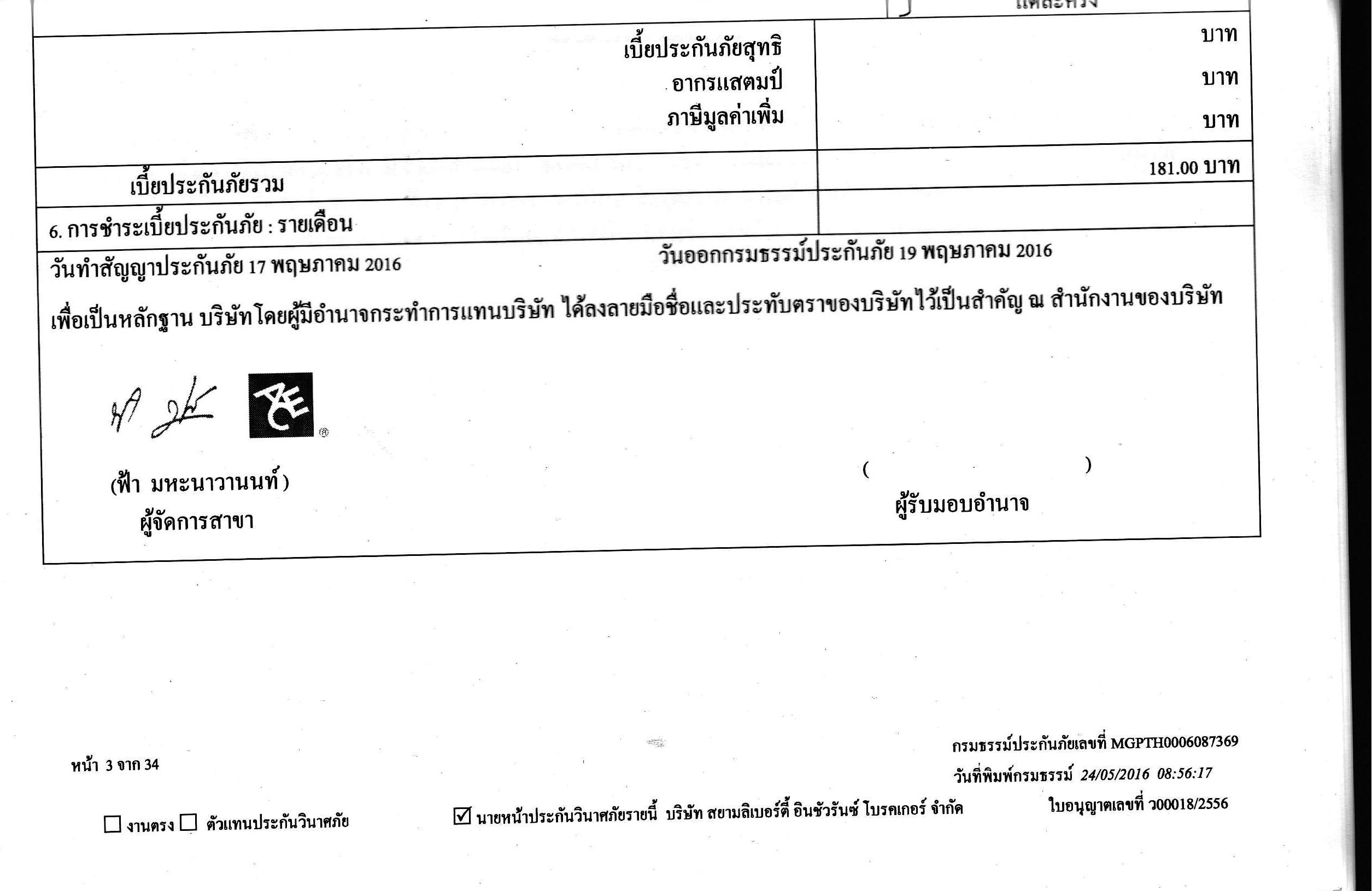 หลังจากนั้นไม่นาน ก็มีเอกสารประกันภัยส่งมา ระบุที่หน้า3ชัดเจน ว่ายอดเงินประกันจำนวน 181.00บ. เราก็พลิกดูหน้าที่เหลือ ก็ไม่เห็นมีรายละเอียดค่าใช้จ่ายอื่น