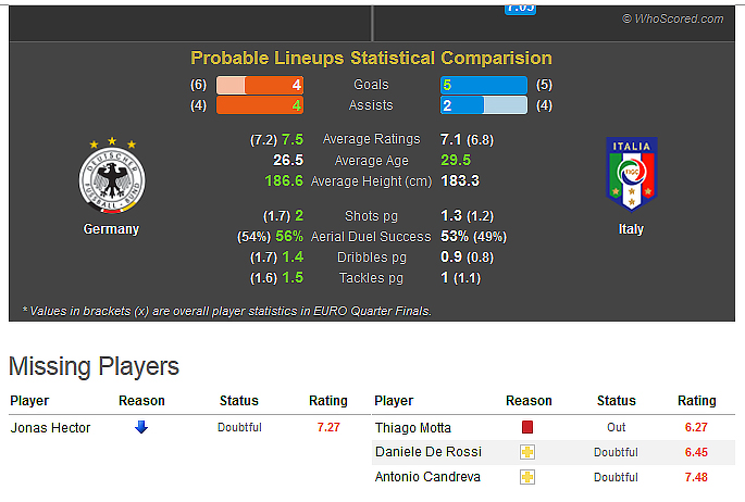 ผู้เล่นที่จะพลาดการลงสนามและเทียบสถิติของ 11 ไลน์อัพ เยอรมันฟูลทีม ส่วนอิตาลีอาการหนักหน่อย เด รอสซี่ กับ คันเดรว่า 50/50 ส่วนม็อตต้าติดโทษแบน แถมเทียบสถิติต่างๆแล้วเยอรมันดูดีกว่าเกือบหมดด้วย