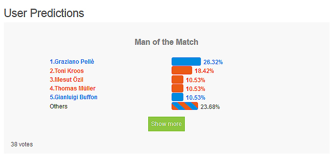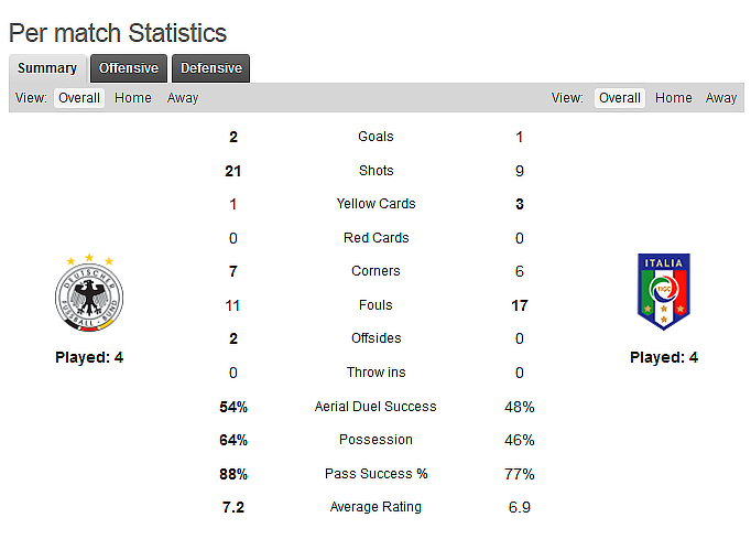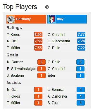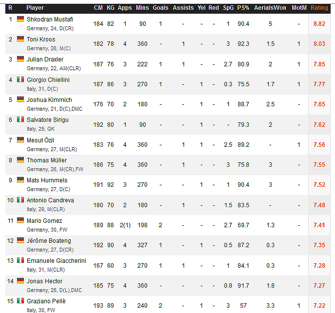 สถิติต่างๆของนักเตะในท็อป 15 คนแรก(รวมทั้งสองทีม) จะเห็นว่าใน 15 คนแรกจะเป็นของฝั่งเยอรมันถึง 10 คนเลยทีเดียว