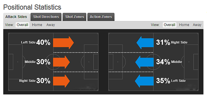ทิศทางการขึ้นบอล(ฝั่งซ้ายเยอรมัน ฝั่งขวาอิตาลี) เยอรมันจะเน้นขึ้นทางฝั่งซ้าย ซึ่งอิตาลีก็เน้นทางฝั่งซ้ายเช่นกัน(แบ็คขวาและปีกขวาของทั้งคู่คงต้องทำงานหนักแน่ๆ)