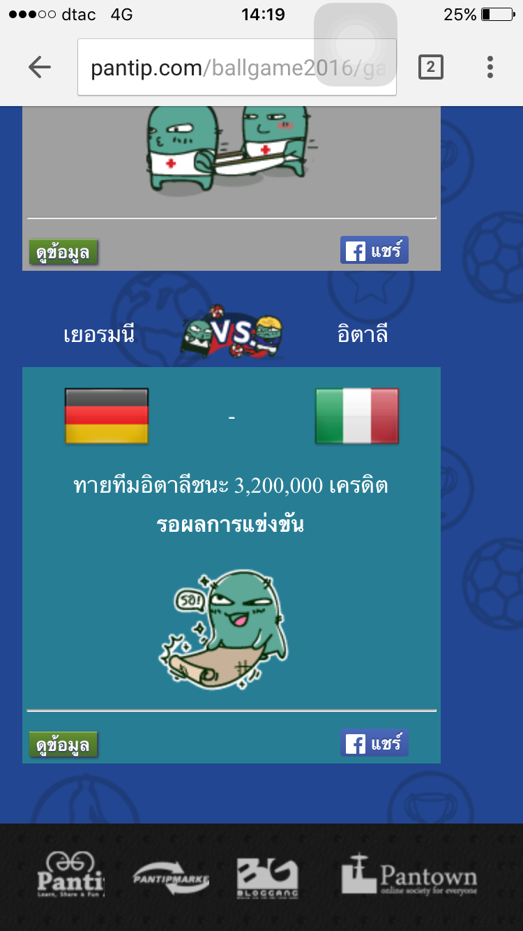 หมดตัววันสุดท้ายพอดีเลย แห่ะๆ ไม่เหลืออะไรเลย ต้องไปกด โบนัสเล่นแล้วละครับ ใครเป็นแบบผมในตอนจบรอบแรกบ้าง ? คืนนี้ว่าจะทาย สวีส นะ เผื่อจะแต้มดี ถ้าแพ้ ก็ สบายใจ เพราะเชียร์ อิตาลี 555 ทา