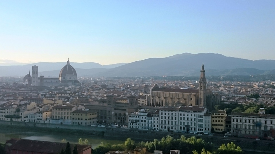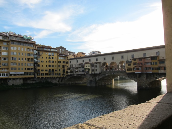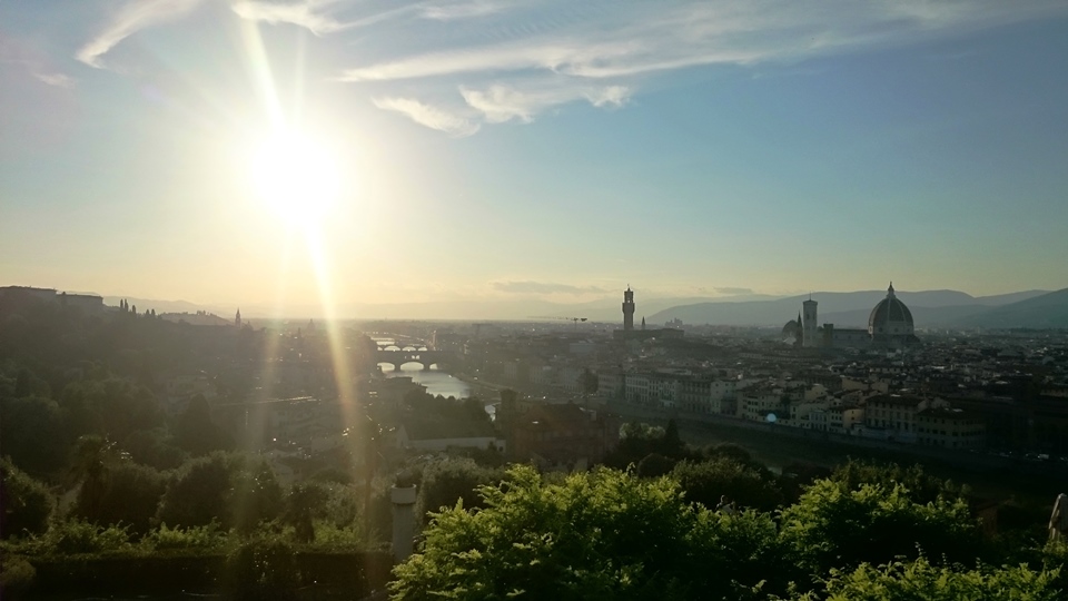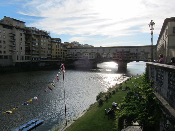 แล้วก็เดินต่อมาที่สะพาน Vecchio ซึ่งเป็น ร้านขายเครื่องประดับสวยๆ นาฬิกาแพงๆ หลายร้านเลย ผมเดินข้ามสะพานเพื่อจะเดินขึ้นไปบน piazzale Michelangelo ซึ่งอยู่บนเนินเขา เพื่อดูวิวเมือง Florence ในมุมสูง ใช้เวลาเดินบ้างหยุดบ้างชมวิวไปเรื่อยๆ จนมาถึงข้างบนก็ได้เห็นภาพแบบนี้ ภาพ อาจไม่สวยเพราะว่าถ่ายย้อนแสง ถ้ามาตอนเช้าคงสวยกว่านี้