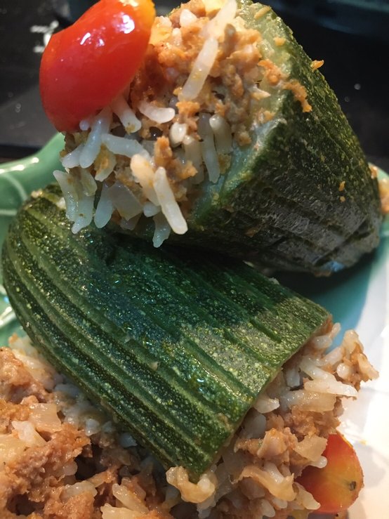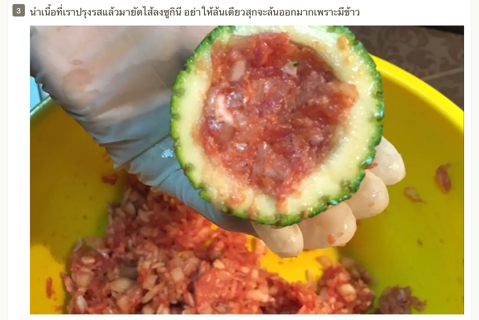 เมนูนี้สามารถดัดแปลงเป็นไก่ หมูก็ได้ แต่ต้นแบบคือเนื้อบด ส่วนน้ำมันงาคือเราชอบส่วนตัว เก็บกดที่นั้นแพงมากเราไม่มีใช้ พอชิมมันหอมมาก แต่เมนูจริงๆไม่มีซอสปรุงรส น้ำมันงา มีแค่เกลือ พริกไทย ปรุงรส มีผักชีลาวและพาสลี่สับละเอียดแต่เรากับสามีไม่ชอบเลยไม่ใส่ เราได้ซูกินีจากงานเกษตรร้านโครงการหลวงในราคา 25 บาท แถมใหญ่อีก เราเจอแต่เล็กๆ ถ้าเจอขนาดนี้ที่ห้างอื่นเคยลองชั่งตก 94 บาทสองผล บ๊าบบายคะ แพงเกินไป ดีใจที่เจอเลยนำมาทำให้สามีทาน แถมเราได้รีวิวอาหารแปลกๆให้ๆเพื่อนดู วิน-วิน อีกแล้ว ออจริงๆในรูปเราใส่ข้าวเยอะกว่าที่บอกเพราะเราชอบ แต่ว่าจริงๆใส่ตามสูตรพอมันจะจับตัวเป็นก้อน ถ้าใส่เยอะมันจะแตกพอคนๆมันจะคล้ายข้าวต้มไปเลย